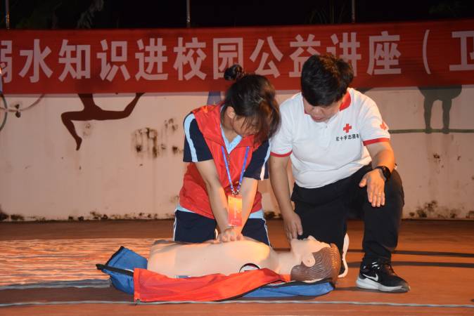 河池市红十字会水上救援队队长林欢向全校师生演示了气道异物梗阻的应急救护技能,并普及溺水事故的防范和救护等相关知识。让学生上台亲自演练海姆立克急救法,使用救生器材对溺水人员进行施救,利用人体模型向学生传授实施心肺复苏等急救知识。整场讲座生动形象,深入浅出,气氛活跃,互动频繁,深受师生欢迎。