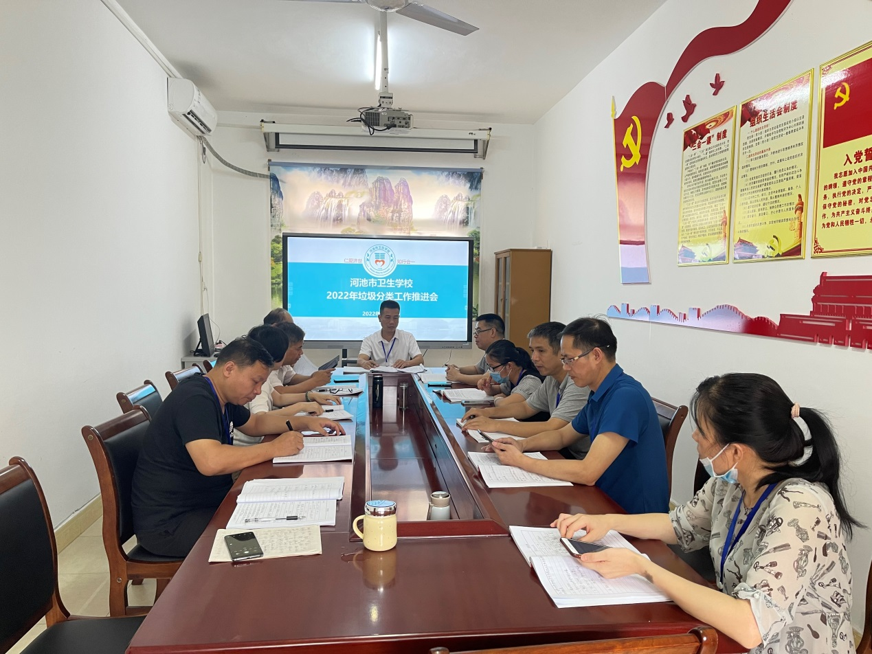 为深入贯彻落实习近平生态文明思想,推动垃圾分类工作走深走实,6月27日下午,河池市卫生学校召开垃圾分类工作推进会。总务科科长江滨汇报了学校生活垃圾分类工作的开展情况,各科室负责人按照河池市垃圾分类工作要求,就如何扎实有效地做好垃圾分类工作建言献策,从宣传教育、硬件配备、职责分工、具体实施、监督考核等方面提出宝贵意见。校长陈朝亮认真听取大家发言后作总结讲话。他指出,学校对垃圾分类工作高度重视,专题研究部署此项工作,各科室要充分认识加强垃圾管理和垃圾分类处理的重要意义,把思想统一到上级要求上来,统一到学校决策部署上来,加强教育引导,做好宣传工作。他要求,在接下来的工作中要做到“三个强化”。第一强化宣传,做到人人认识到位。第二加强投入,做到设施、服务到位。第三强化检查考核,做到责任落实到位。第四完善奖惩制度,树立垃圾分类工作开展榜样和标杆。他强调,垃圾分类是一项长期的工作,只有各部门齐心协力,才能很好地完成这项工作。