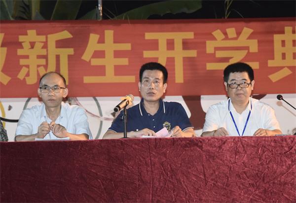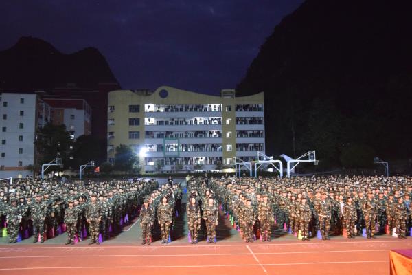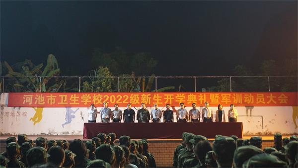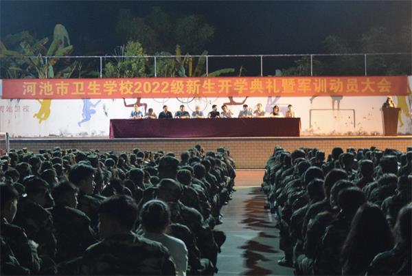 时维金秋,硕果盈枝。9月2日晚上7点30分,河池市卫生学校在田径运动场举行2022级新生开学典礼暨军训动员大会。校长陈朝亮,副校长刘钢、周轩,各职能部门负责人、承训武装部领导周扬杰、新生班主任和2022级全体新生参加大会。学校办公室主任韦恩豪主持会议。