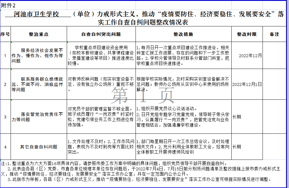 河池市卫生学校力戒形式主义,推动“疫情要防住、经济要稳住、发展要安全”落实工作自查自纠问题整改情况表