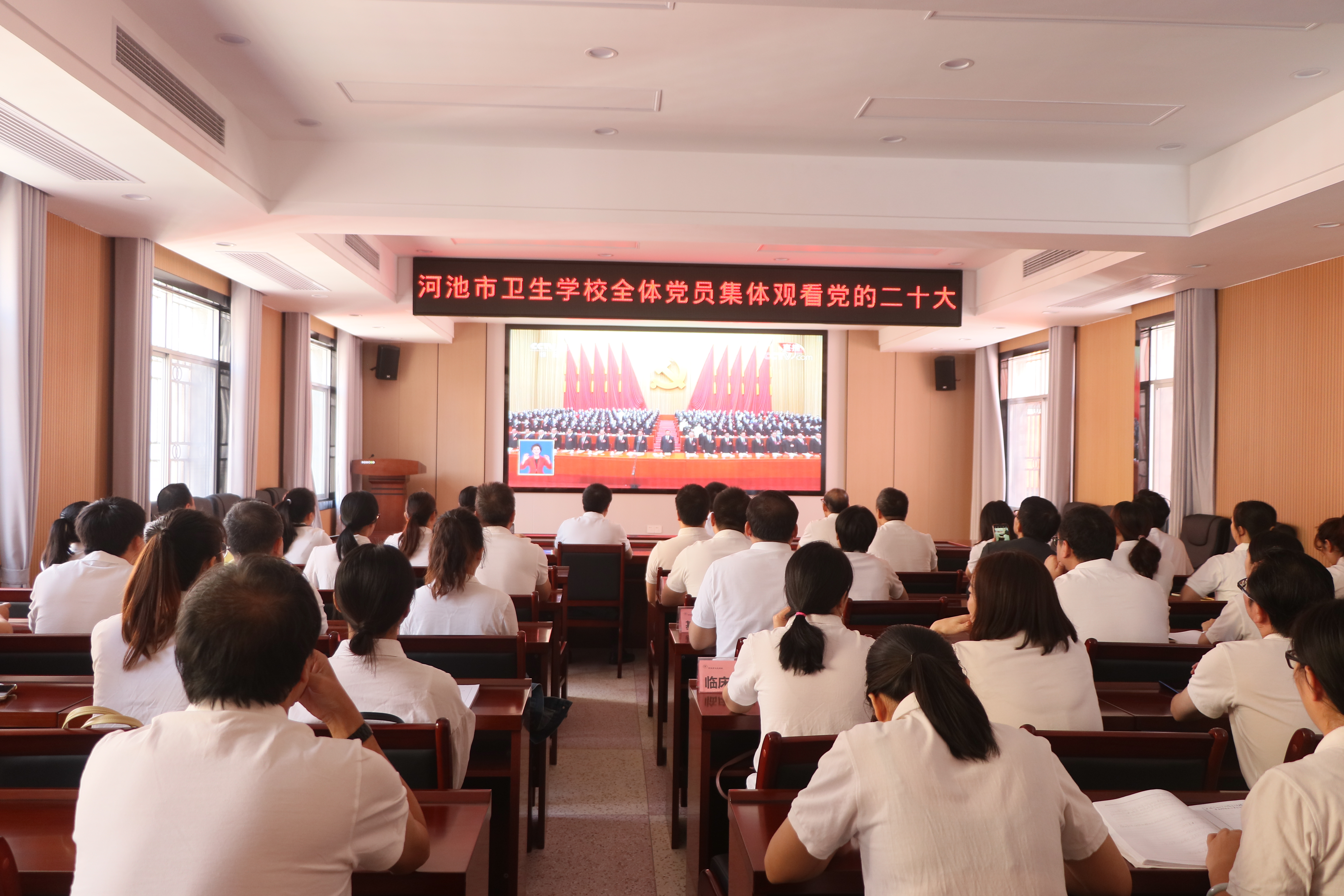 10月16日上午10时,中国共产党第二十次全国代表大会在北京开幕。河池卫校组织党员教师、部分学生代表集中收听收看党的二十大开幕会,并认真组织开展党的二十大报告专题学习,学习氛围十分浓厚,反响热烈。