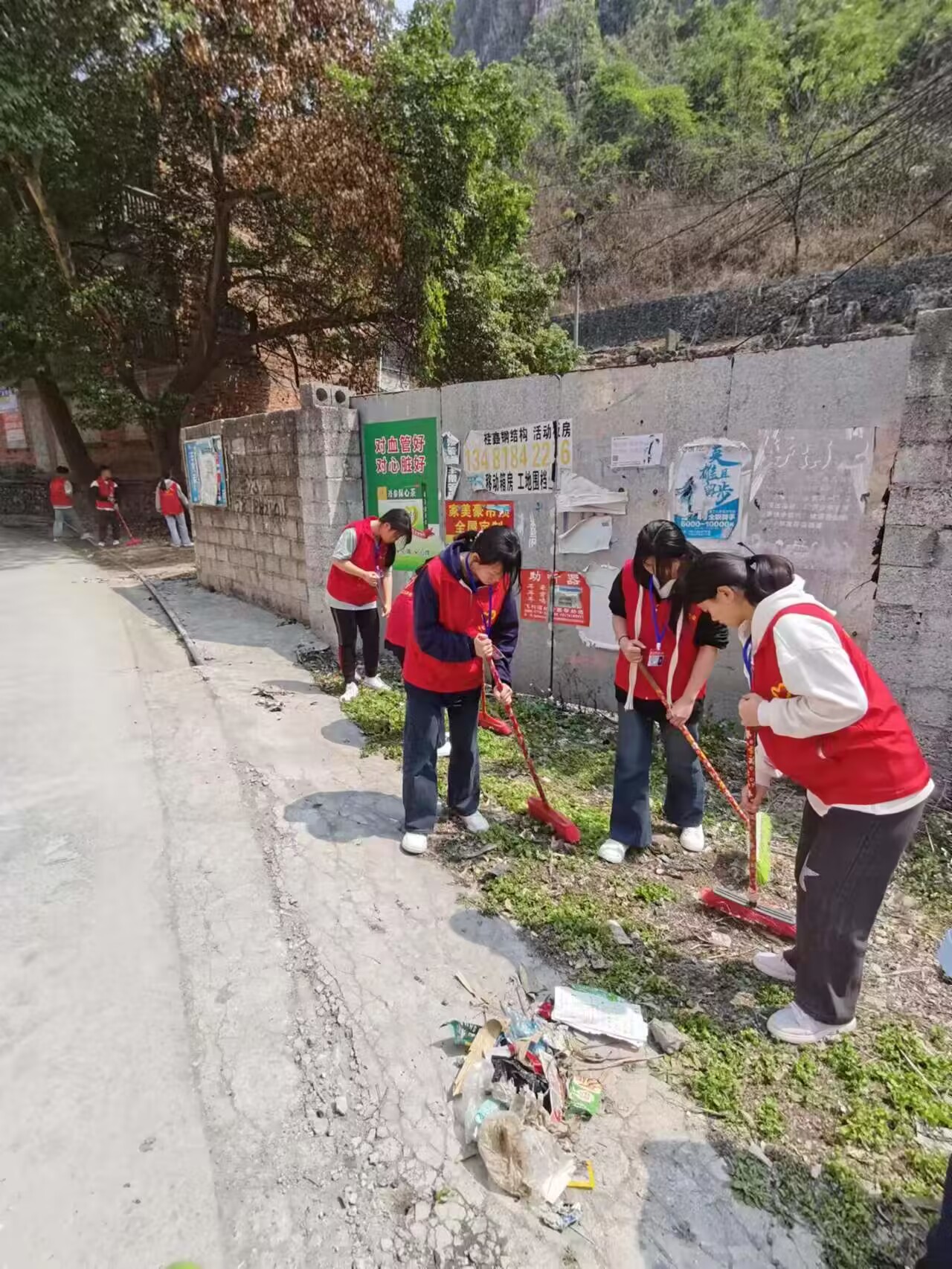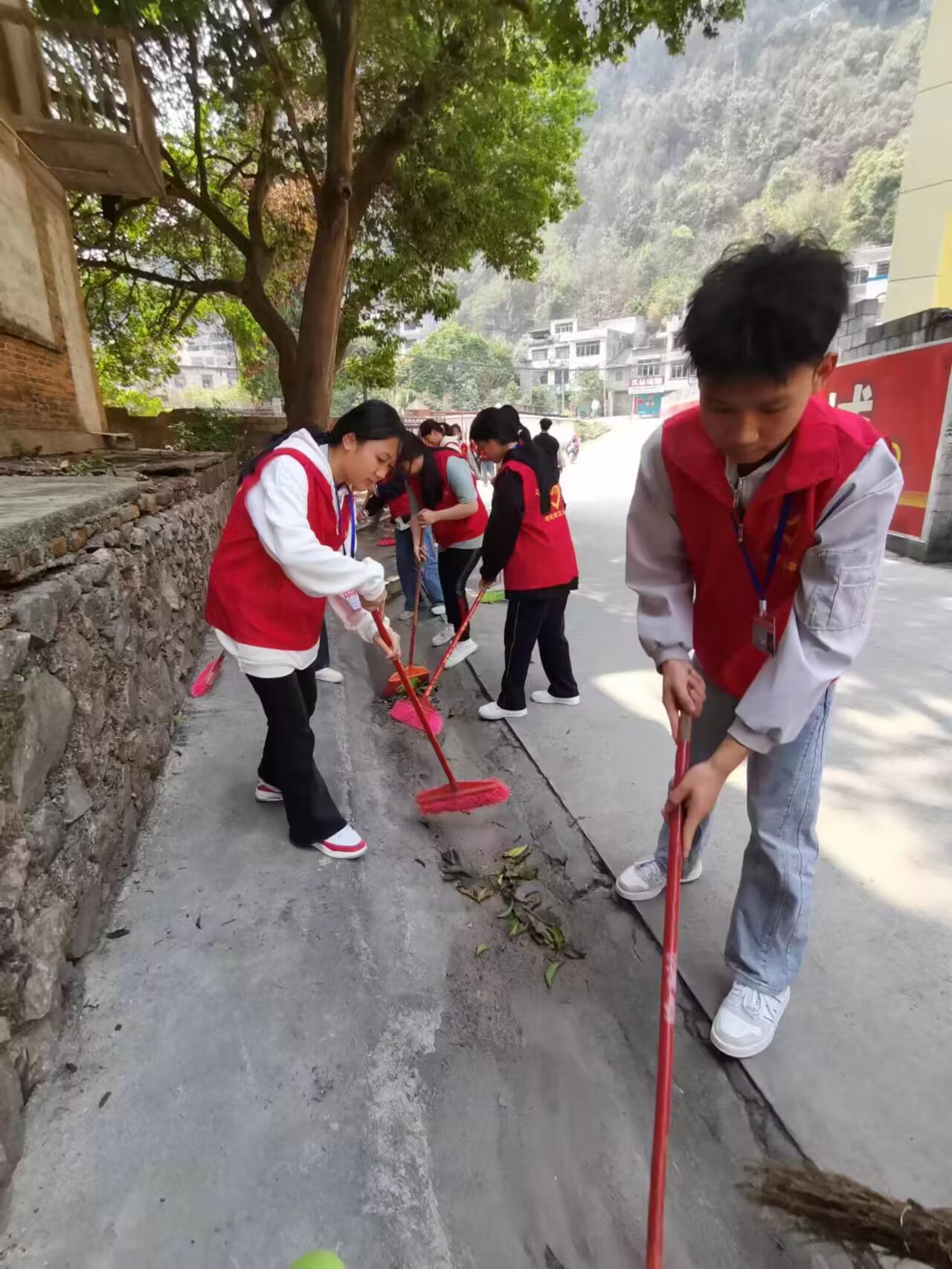 志愿学生们打扫路面