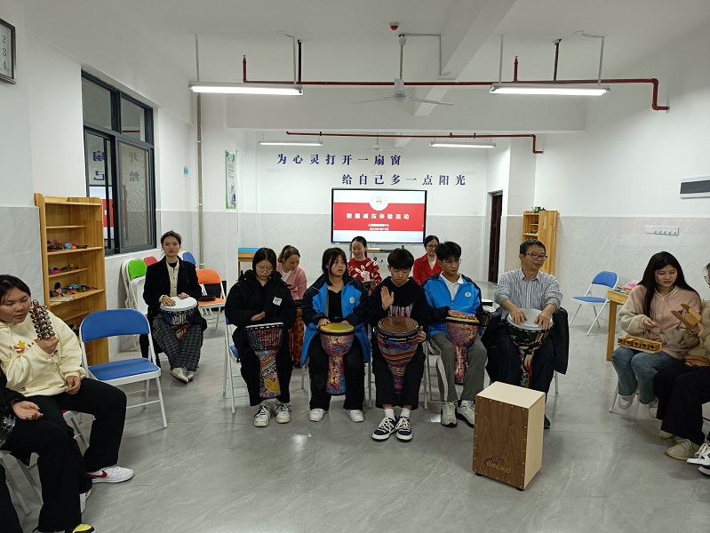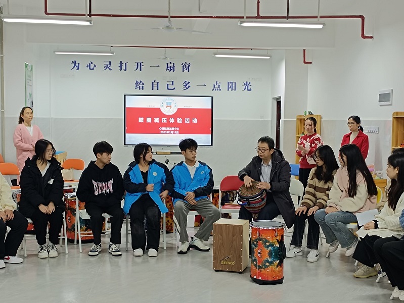 心理健康发展中心石华老师首先介绍鼓圈的起源、发展、作用,然后简单演示每一件乐器的使用方法,参与活动的师生们从熟悉各自手中的乐器入手,轮流上场扮演鼓圈引导师,虽然经验不足,动作生疏,甚至节奏感不强,但他们都渐渐的投入到音乐的集体演奏中,体会到酣畅淋漓的宣泄感。