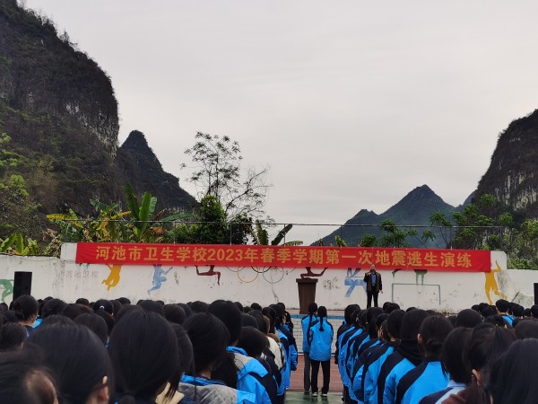 3月27日上午,河池市卫生学校开展了地震逃生演练,在校学生约3000人参加演练,演练活动包括应急避震和紧急疏散两个内容。