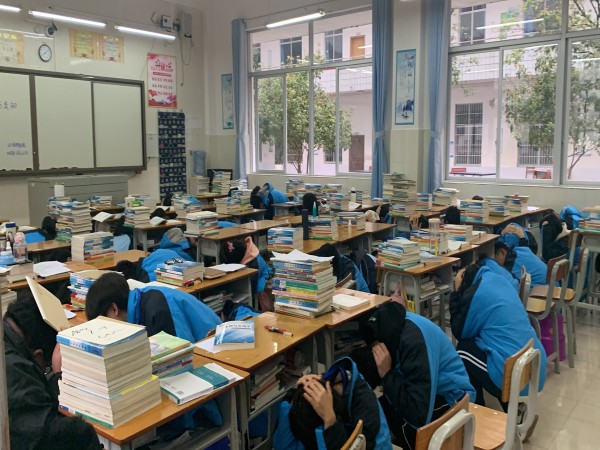 第一声警报响起,各班班主任指挥学生做好避震准备,同学们立即停止活动,迅速躲到课桌底下。