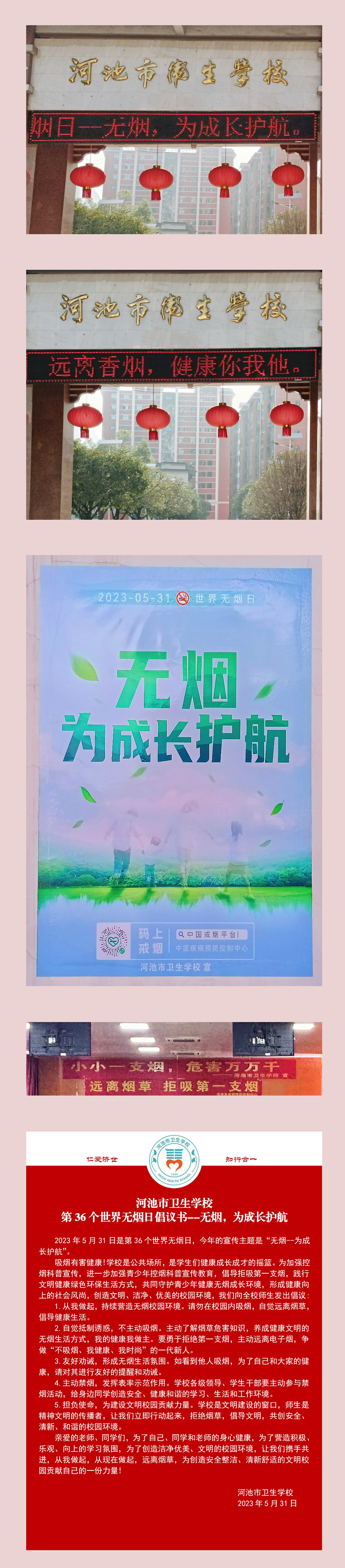 2023年5月31日是第36个世界无烟日,本次世界无烟日的主题是“无烟 为成长护航”。为进一步巩固无烟学校创建成果,河池市卫生学校积极开展“第36个世界无烟日”系列宣传教育活动。