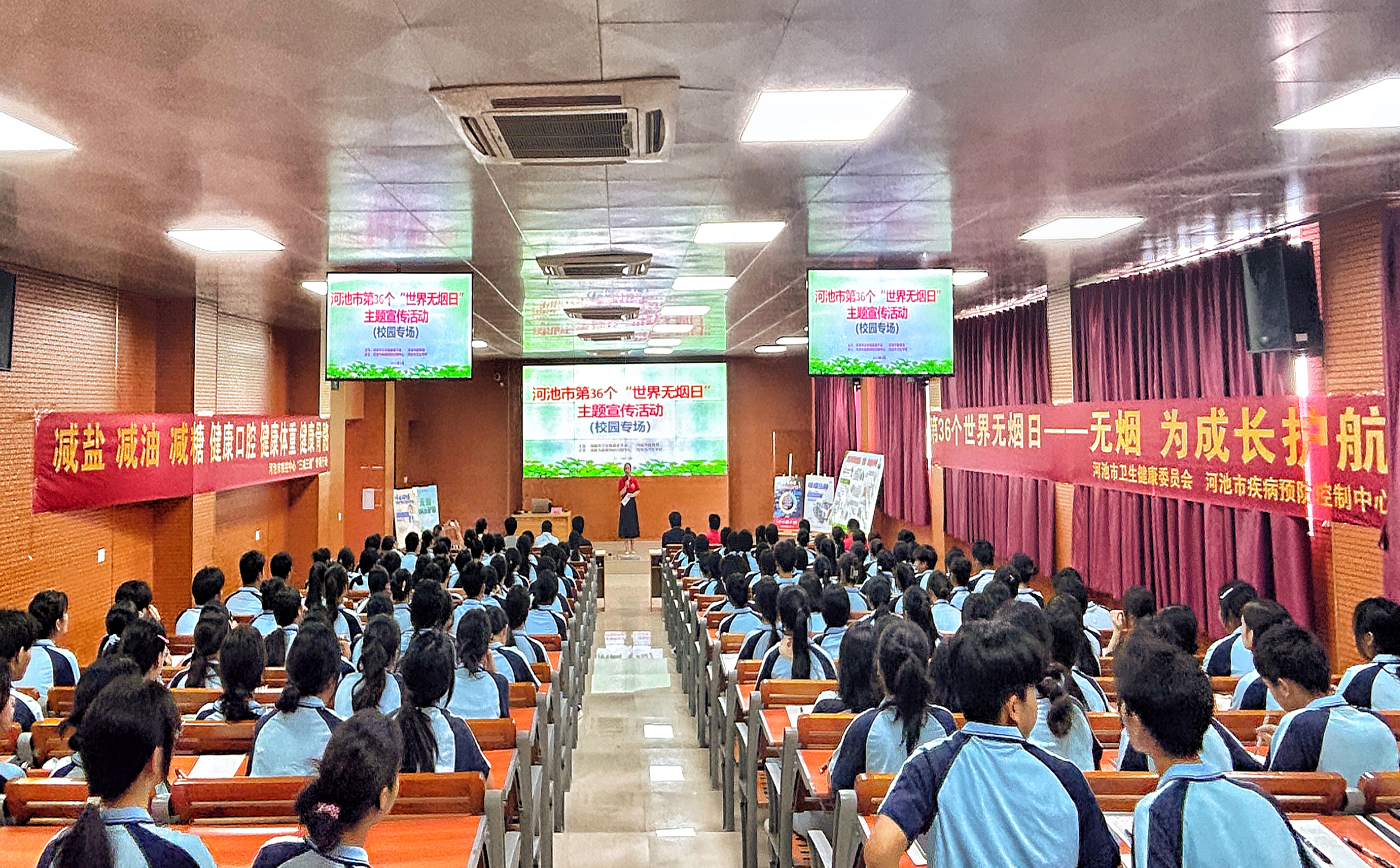 5月30日,学校联合河池市卫健委、教育局、疾控中心共同举办第36个世界无烟日主题宣传活动(校园专场),活动内容丰富多彩。首先,是河池市中医医院肺病科主任覃露海医生带来的控烟知识专题讲座;讲座围绕就吸烟对生命健康、自然环境的危害作具体描述,特别强调了吸烟对青少年的严重危害:影响肺脏发育,造成智力损伤和记忆力减退,易诱发身体疾病和不良行为习惯等,号召大家珍视生命健康,保护环境健康,远离烟草危害。讲座过后,是有奖问答环节,根据覃露海医生所传递的禁烟相关知识进行问答,同学热情高涨,积极参与,答题正确率高,多位学生获得了卫生健康小礼品。接着,开展了“无烟 为成长护航”学生签名活动,学生们纷纷在宣传横幅上留下自己的名字并表示,作为卫校学子,要时刻警惕吸烟的危害,坚决拒绝第一支烟,坚决拒绝吸二手烟,当好禁烟的实践者和倡导者。活动最后,学生们亲手写下对吸烟长辈的“戒烟信”并在微信朋友圈积极转发禁烟知识,希望更多的人关注烟草危害,增强责任感和自我控制能力,为自己和家人健康保驾护航。