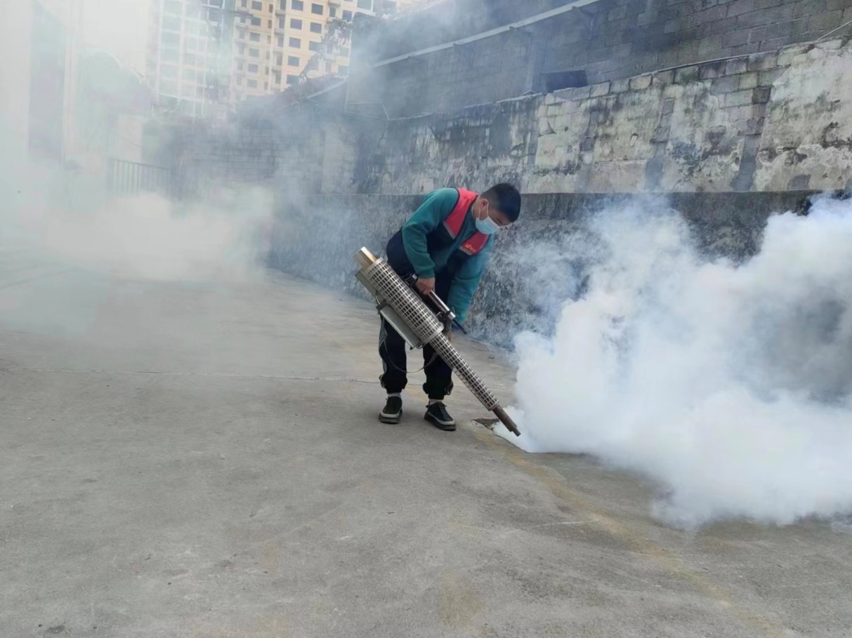 专业人员选用“杀菌力强、消灭病毒时间短、对人体安全无毒”的消杀雾剂,用背负式喷雾器、热烟雾机、机动喷雾器对教学楼、宿舍楼、食堂、花坛周边、树木和绿化带等区域开展消杀作业,同时还对下水道、排水沟等容易滋生病媒生物的重点部位进行地毯式的药物喷洒和消杀,沿建筑物、围墙边等容易出现老鼠和蟑螂的地方布置鼠盒、毒饵盒,投放鼠药并做好标记。