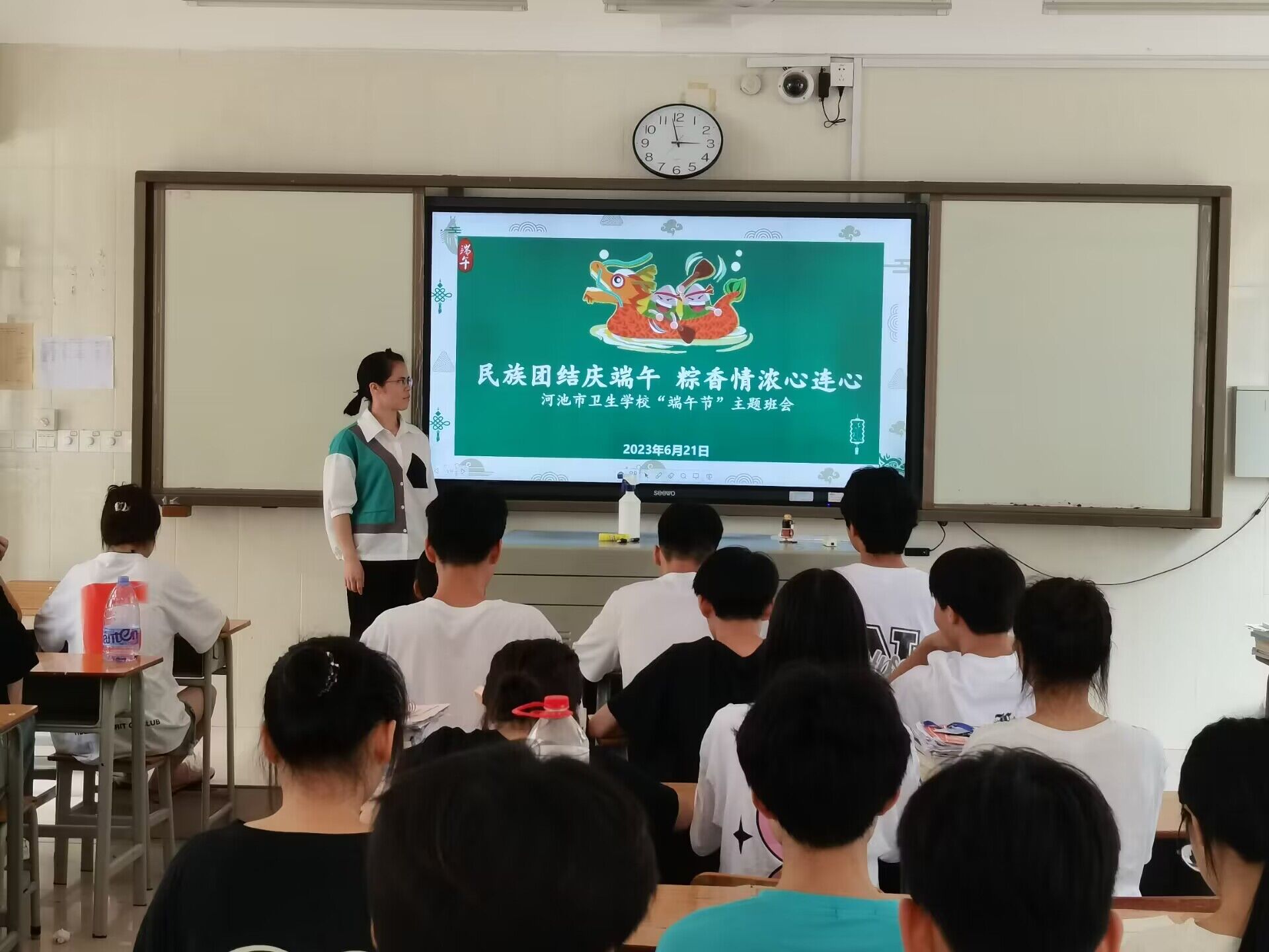 悠悠艾草香,片片粽叶长,一年一端午,一岁一安康。为传承和弘扬中华民族的优秀传统文化,河池市卫生学校组织各班于2023年6月20-21日下午开展“民族团结庆端午 粽香情浓心连心”端午节主题班会。在主题班会中,各班的班主任精心准备,先是带领同学们一起追溯端午节的由来,详细介绍了赛龙舟、吃粽子、挂艾草与菖蒲、聚午宴、端午浴(浴兰)、挂艾草等民族风俗以及端午节的祈福方式。最后又邀请同学们一起欣赏端午节相关的诗词,感受文人墨客笔下的节日风情。