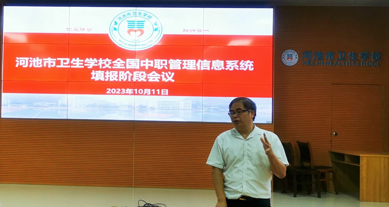落实数据填报质量,明确数据填报分工,铺设双优学校建设道路,对接现代职业教育质量提升计划项目建设,保障中职学校办学条件达标工程,河池市卫生学校于2023年10月11日召开全国中职管理信息系统数据填报阶段统筹会议。