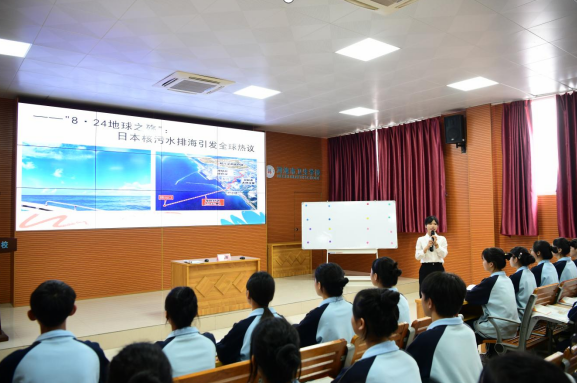 第一节课由陈香慈老师执教。陈老师借8·24日本向太平洋排放核污水的新闻导入新课,让同学们思考日本排放核污水会对中国产生哪些影响,接着将同学们分成四组讨论并写在纸上依次上台展示。通过合作探究,讲授分析,角色扮演的方法解决了本次课的重点难点问题,同时融入二十大报告中生态文明建设是关乎人类未来和福祉,生态环境直接关系人类否在地球上幸福生活的观点进行了升华.