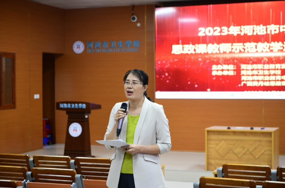 本次活动在河池市卫生学校举行,市教育局职业教育与成人教育科负责人、市职业教育发展中心主任覃泽耀、市职业教育中心学校教师、市卫生学校教师以及广西黄丹峻思政课名师工作坊坊员等180余人参加本次活动。市卫生学校陈香慈老师和市职业教育中心学校谭凤潭老师围绕《世界是普遍联系的》的授课内容,分别为大家展示了精彩的同课异构示范课。