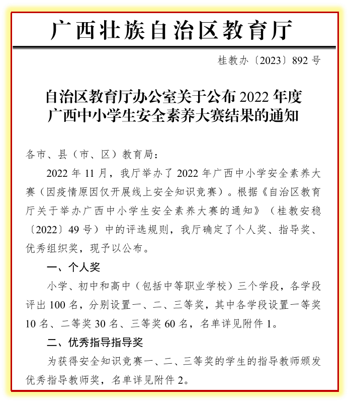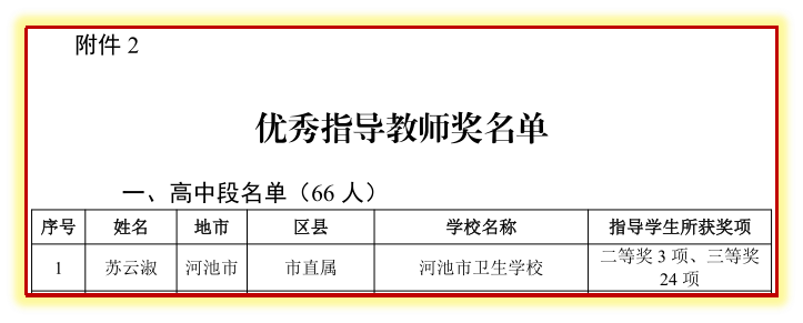 热烈祝贺河池市卫生学校在广西壮族自治区教育厅组织举办的2022年广西中小学安全知识竞赛中荣获27个奖项,其中二等奖3项和三等奖24项。同时,学校教师苏云淑被评为优秀指导教师。