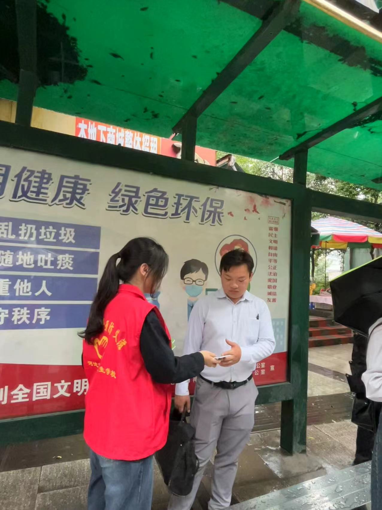 活动开始不久,天空下起了淅沥沥的小雨,但学校志愿者的服务热情丝毫不减:他们撑着雨伞,积极地向路过的居民、沿街的商贩们发放艾滋病防治知识宣传手册,不仅认真讲解艾滋病防治知识、政策、检测等相关信息,还积极发挥医学专业学生优势,为居民们提供现场答疑;营造了良好的活动氛围。