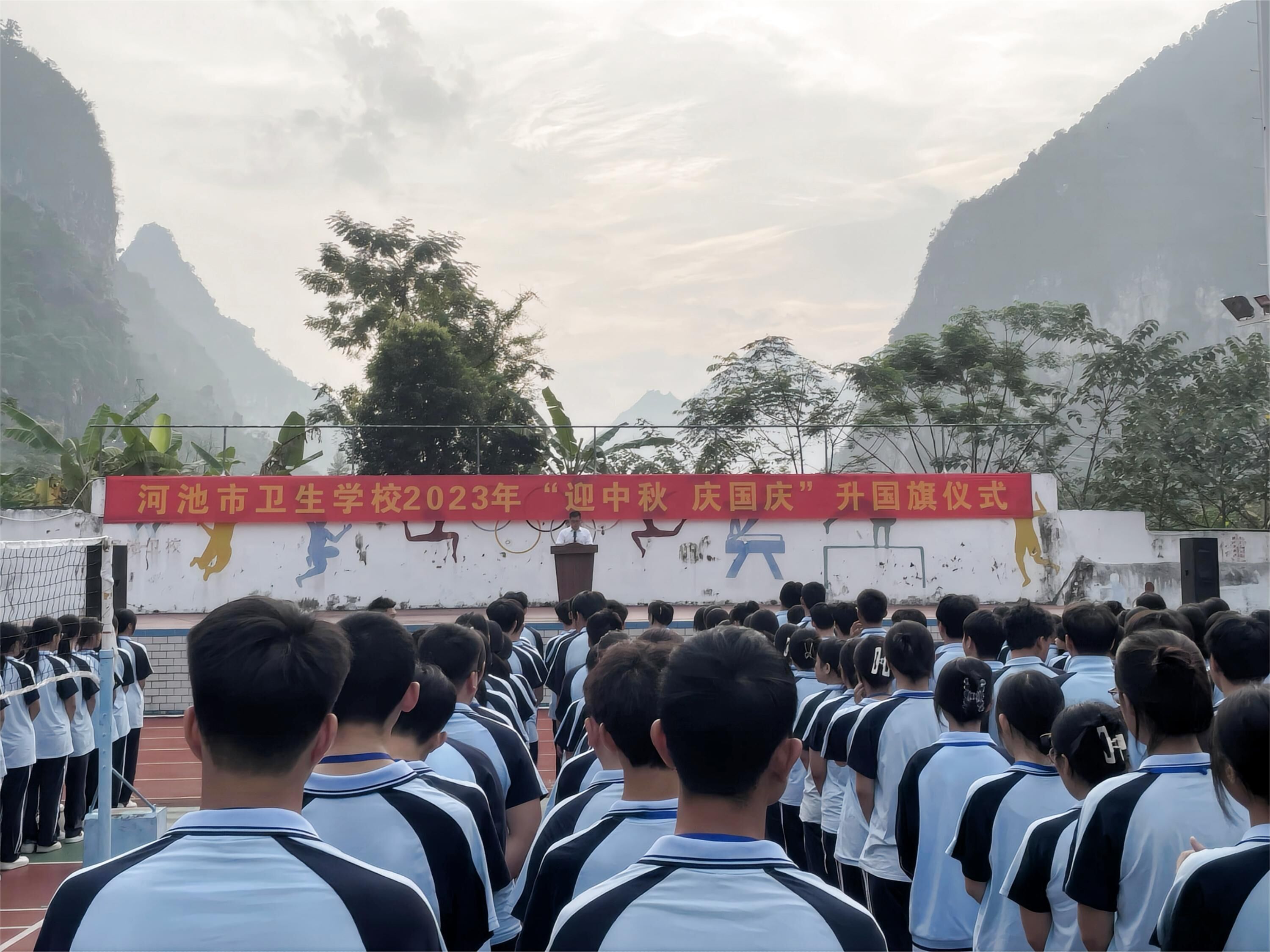 9月28日上午,河池市卫生学校在学校运动场举行2023年“迎中秋 庆国庆”升国旗仪式,向伟大祖国致以崇高敬意和美好祝福,学校3000多名师生参加此次活动。学校党总支纪检委员、副校长刘钢出席仪式并讲话。