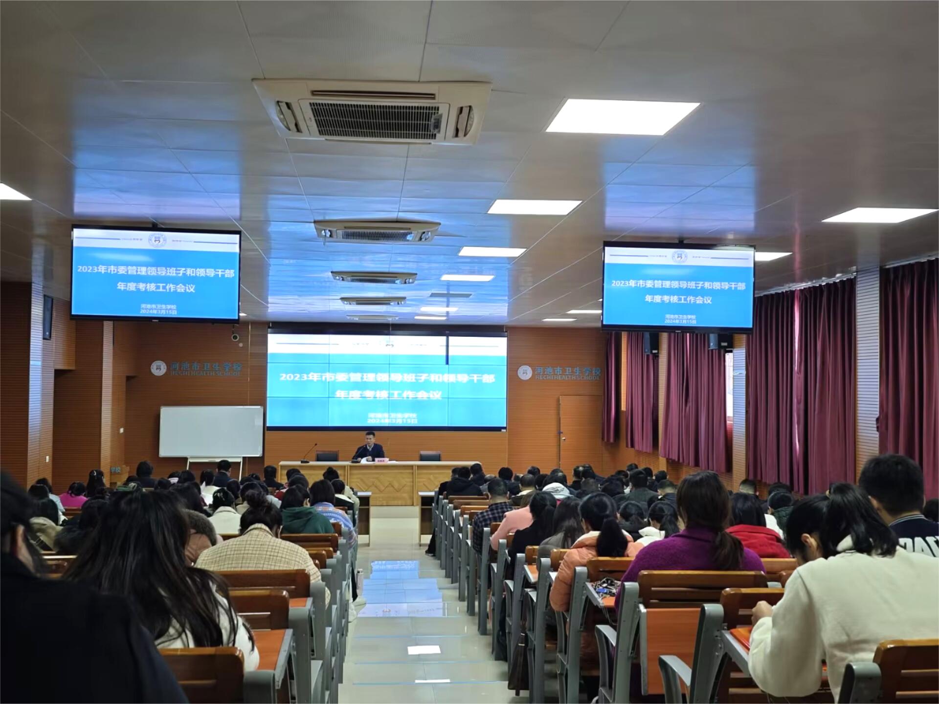 2024年3月15日下午,学校2023年市委管理领导班子和领导干部年度考核工作会议在学校第四阶梯教室如期举行。参加会议的有市委组织部干部二科科长黄江山、市纤维检验所办公室主任罗黎姿、市卫生健康委人事科科长罗乾茂、学校领导及全体教职工,会议由党总支书记、校长陈朝亮主持。