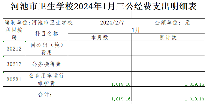 河池市卫生学校2024年1月三公经费支出明细表