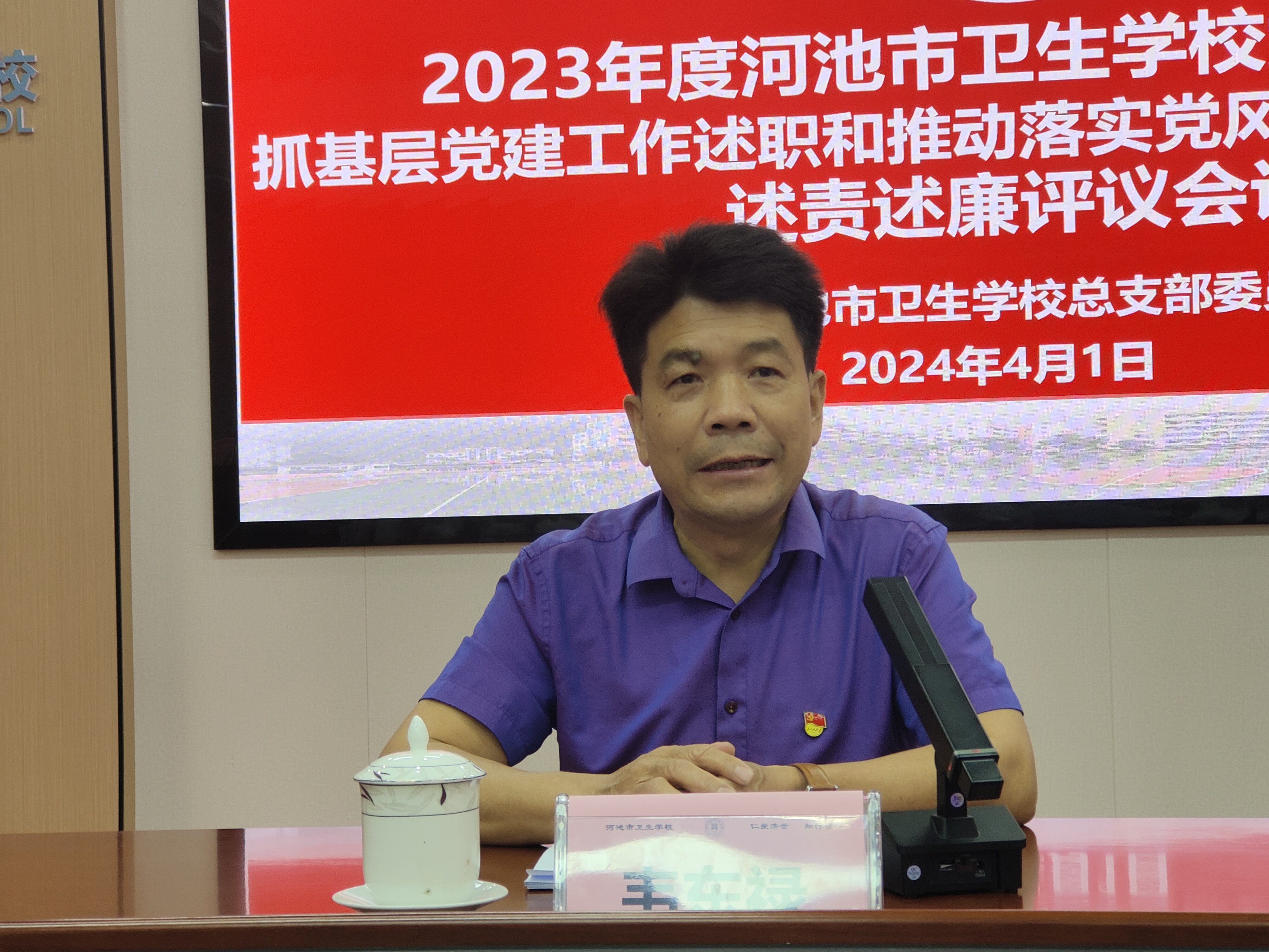 41日,校召开2023年度党支部书记抓基层党建工作述职推动落实党风廉政建设主体责任述责述廉评议会议总支书记陈朝亮同志主持会议并作讲话,市卫生健康委二级巡视员韦东禄同志到会指导全体全体党员、预备党员、发展对象、积极分子参加了会议。