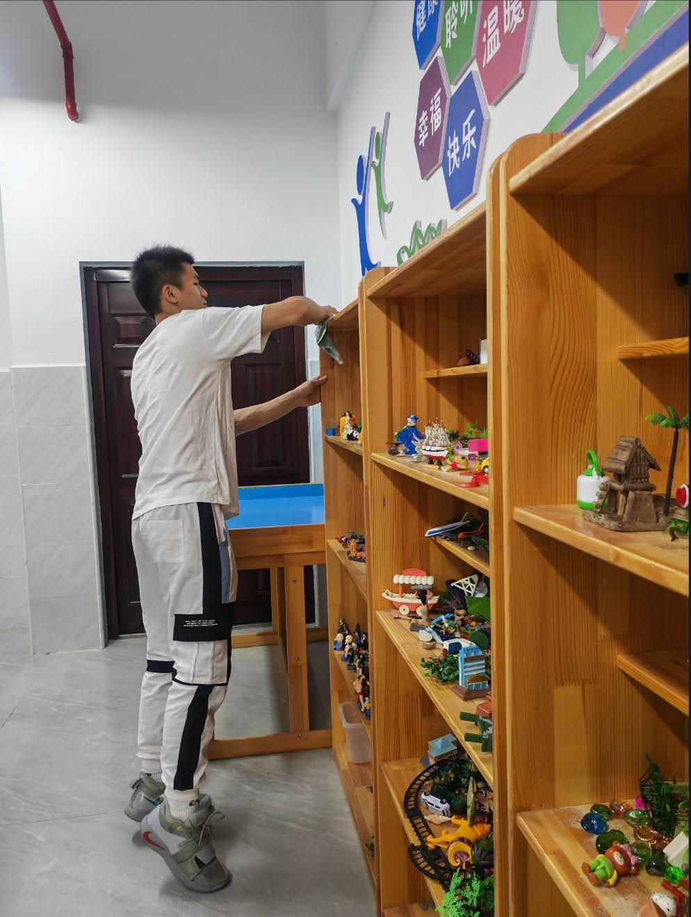 活动中,基础党支部党员分工明确,行动有序,有的拿起抹布,细心地擦拭着办公电脑和打印机;有的负责整理心理沙盘用品,让沙盘室更加整洁有序;有的负责地面的清扫,整个活动现场洋溢着积极向上的氛围。