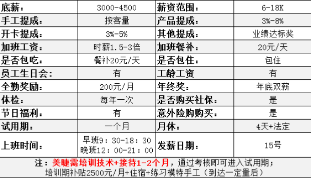 美睫师(若干),工资范围约 6-18K,培训期补贴2500/月+住宿+练习手工(达一定量),培训期1-2个月,通过考核即可进入试用期。带薪培训需入职一年。
