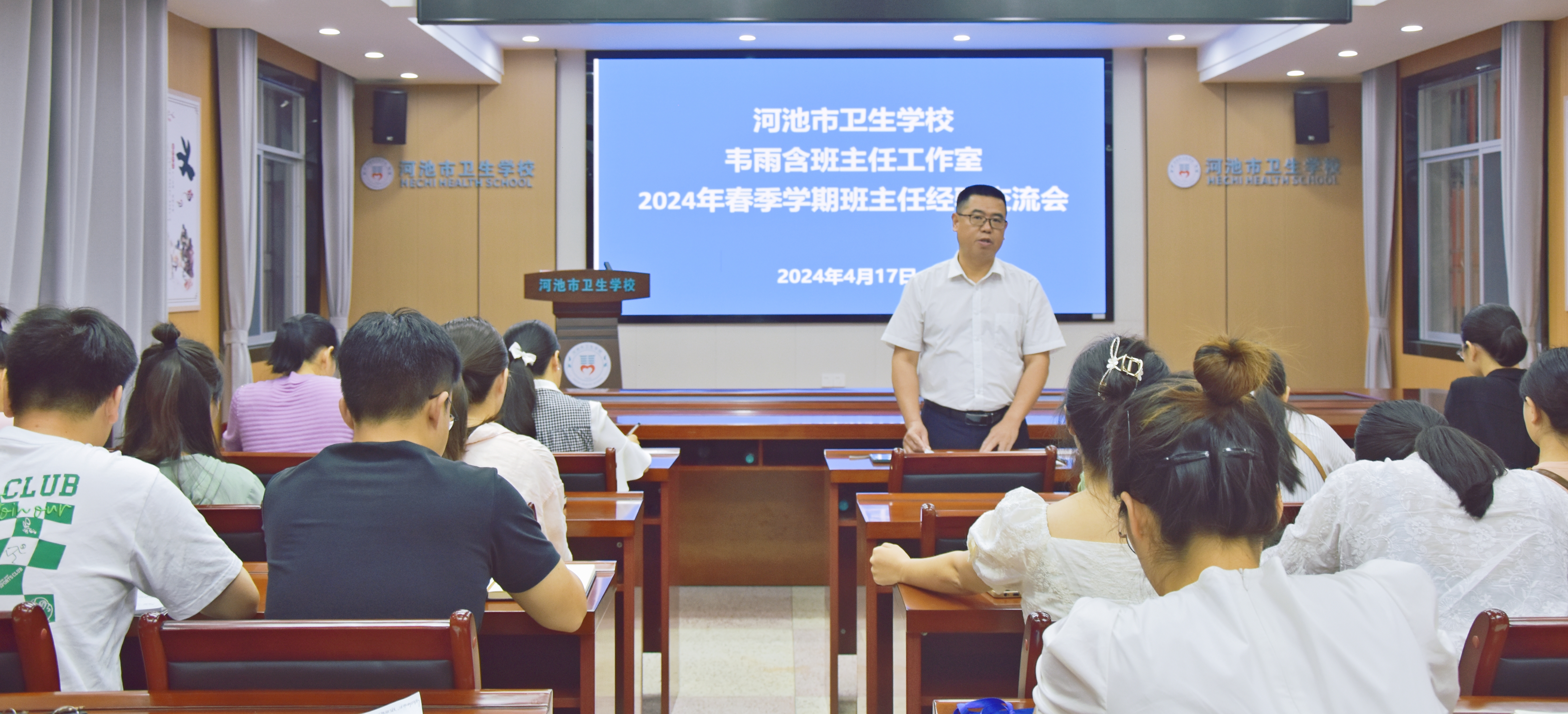 4月17日河池市卫生学校在办公楼五楼会议室举行2024年春季学期班主任工作经验交流会,会议由韦雨含班主任工作室主持人韦雨含主持