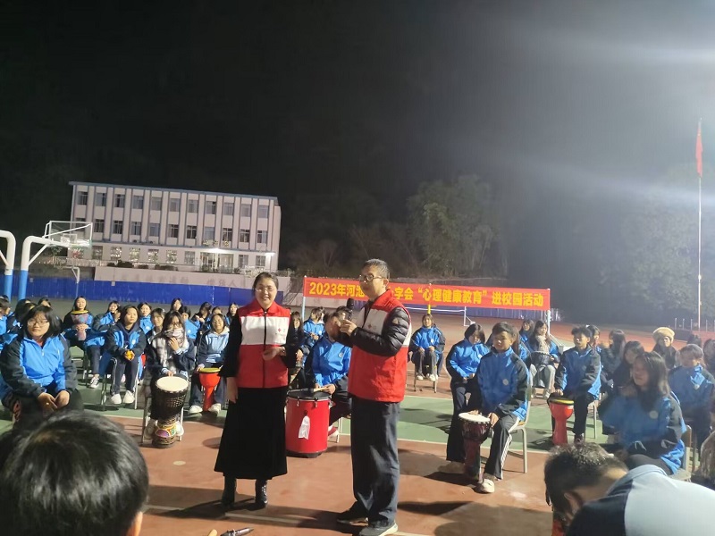 2023年12月13日晚,河池市红十字会心理救援队到河池市卫生学校开展心理健康教育进校园活动,活动内容为开展鼓圈体验活动.