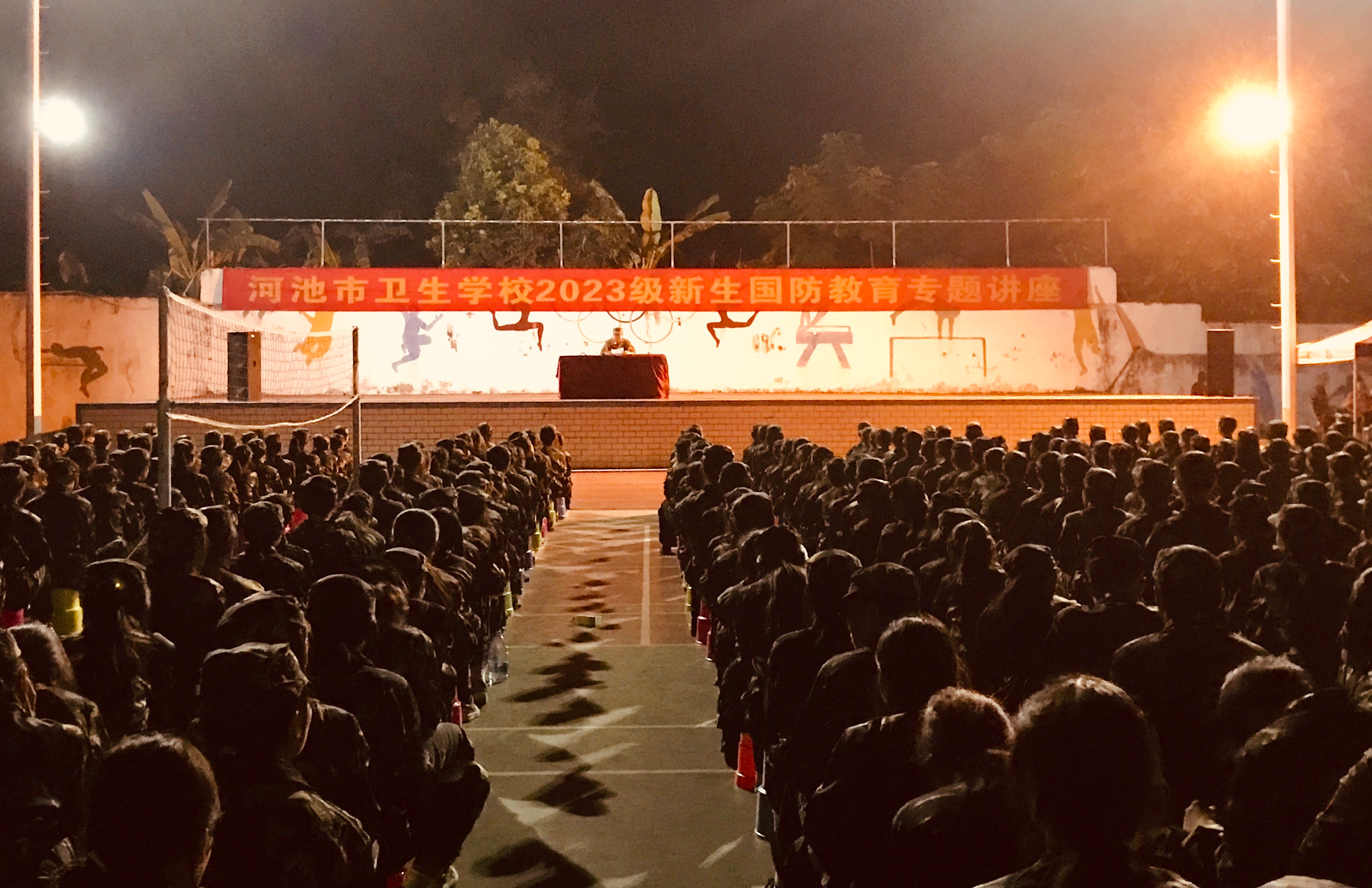 为了增强新生对我国国防建设的关注和了解,加强学生爱国主义教育。2023年9月11日晚上7点30分,河池市卫生学校在学校运动场举行2023级新生国防教育专题讲座。全体新生和班主任1300多人参加大会。学生科副科长张乐平主持会议。