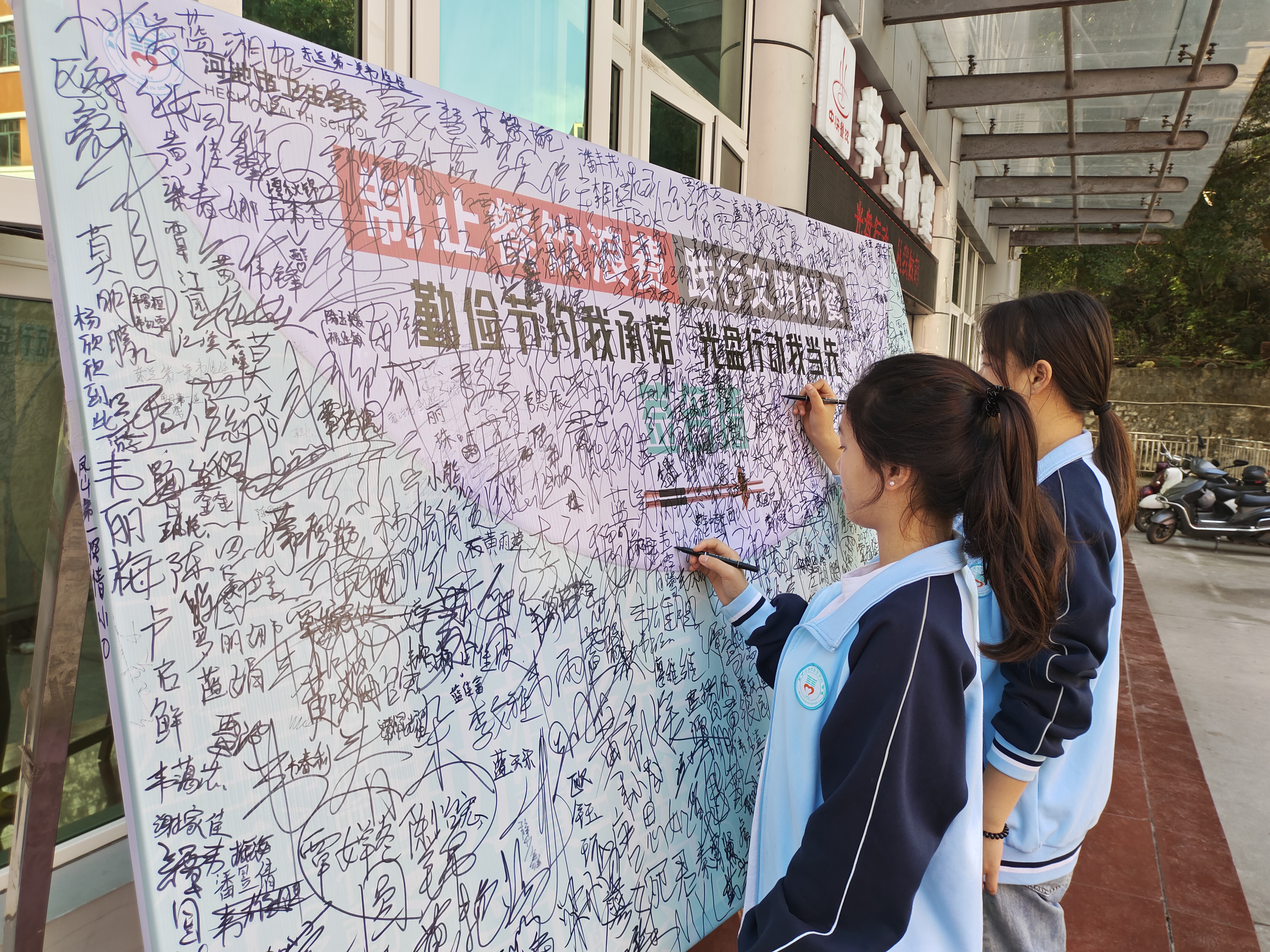 行政支部和学工支部还开展了一系列的活动。通过国旗下讲话、电子走屏、宣传橱窗、校园海报、校园广播、主题班会、校园网站等宣传媒介,对师生进行节约粮食、反对浪费的宣传,学习《中华人民共和国反食品浪费法》,开展“制止餐饮浪费、践行文明用餐、勤俭节约我承诺、光盘行动我当行”倡议签名活动,组织全体师生签署“崇尚勤俭,反对浪费”承诺书。