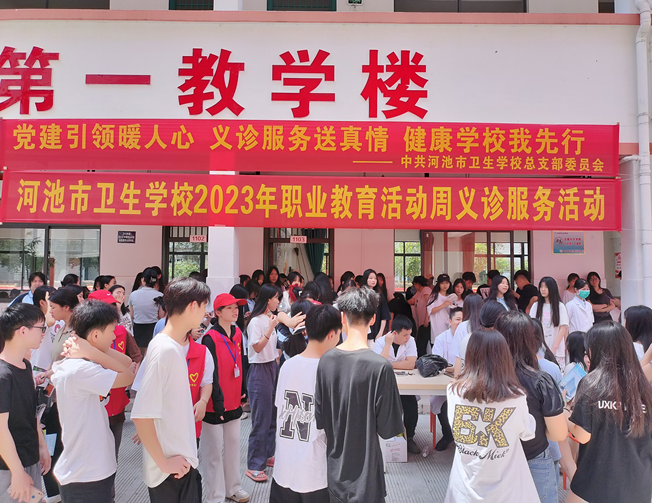5月28日上午,河池市卫生学校联合河池市人民医院在学校第一教学楼前开展2023年职业教育活动周义诊服务活动,积极为师生及校内居民提供健康义诊服务,用实际行动彰显卫生职业教育风采。