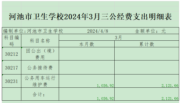 河池市卫生学校2024年3月三公经费支出明细表