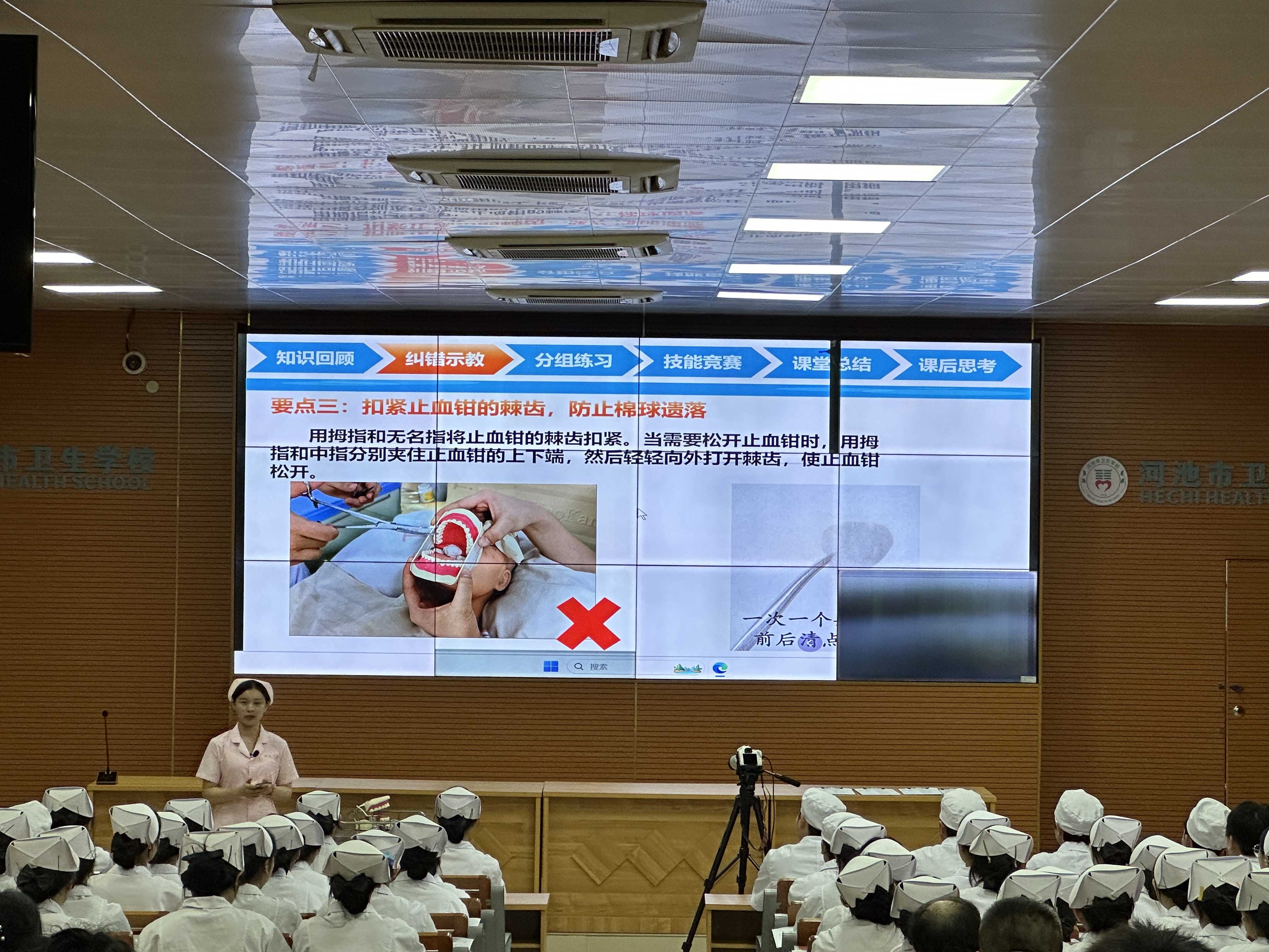 课上罗老师先带领学生回顾特殊口腔护理的理论知识,播放学生上传的练习视频,针对学生练习时出现的易错点进行着重讲解,攻破难点,并利用大屏投屏进行正确示教规范学生的操作。再组织学生分组练习和技能竞赛,教师进行巡回指导,拍摄精彩瞬间上传至学习通。学生积极参与、善于发现错误、勇于展示,课堂气氛和谐、活跃。