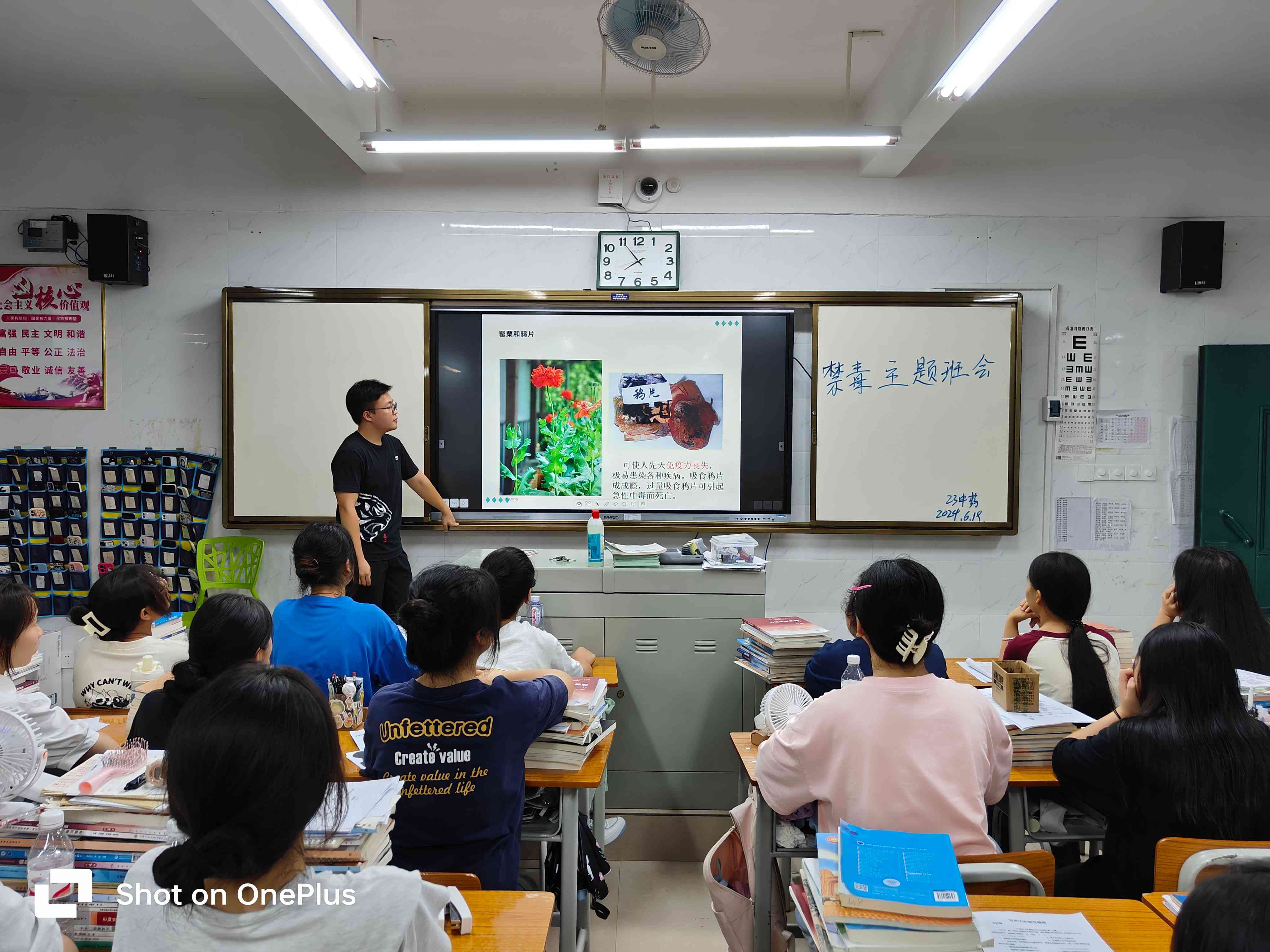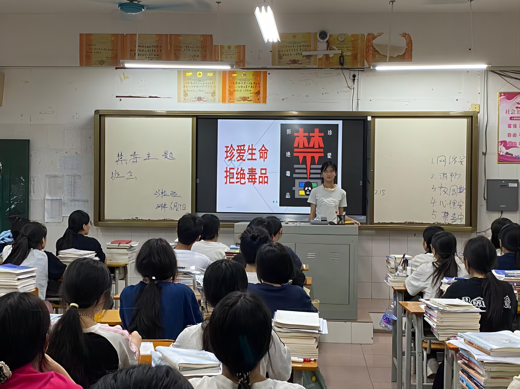 主题班会课上,班主任们通过视频、课件等多种形式向同学们介绍毒品的概念、分类、特征、生理危害、心理危害和社会危害,让同学们知道易染毒渠道以及毒品违法犯罪的相关处罚,掌握远离、拒绝毒品的方法与技能。