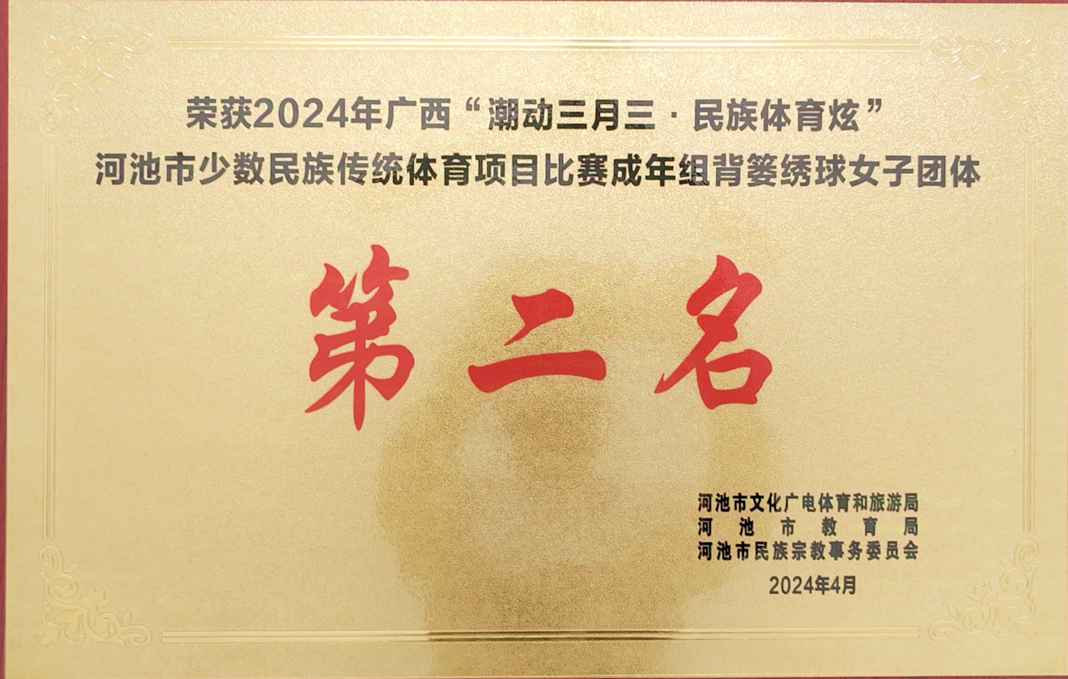 荣获2024年广西“潮动三月三,民族体育炫”河池市少数民族传统体育项目比赛成年组背篓绣球女子团体第二名-河池市文化广电体育和旅游局