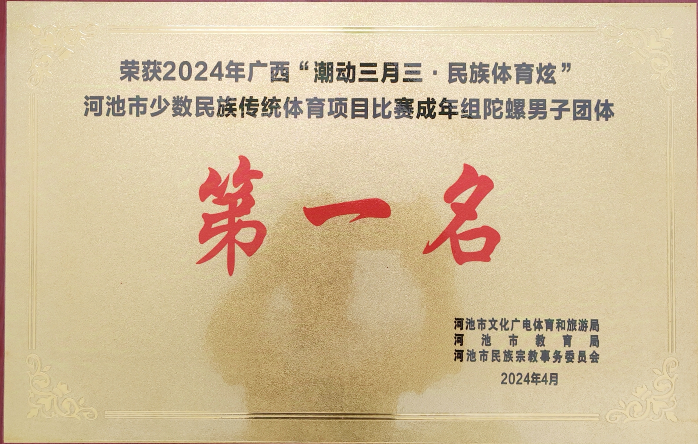 荣获2024年广西“潮动三月三,民族体育炫”河池市少数民族传统体育项目比赛成年组陀螺男子团体第一名-河池市文化广电体育和旅游局