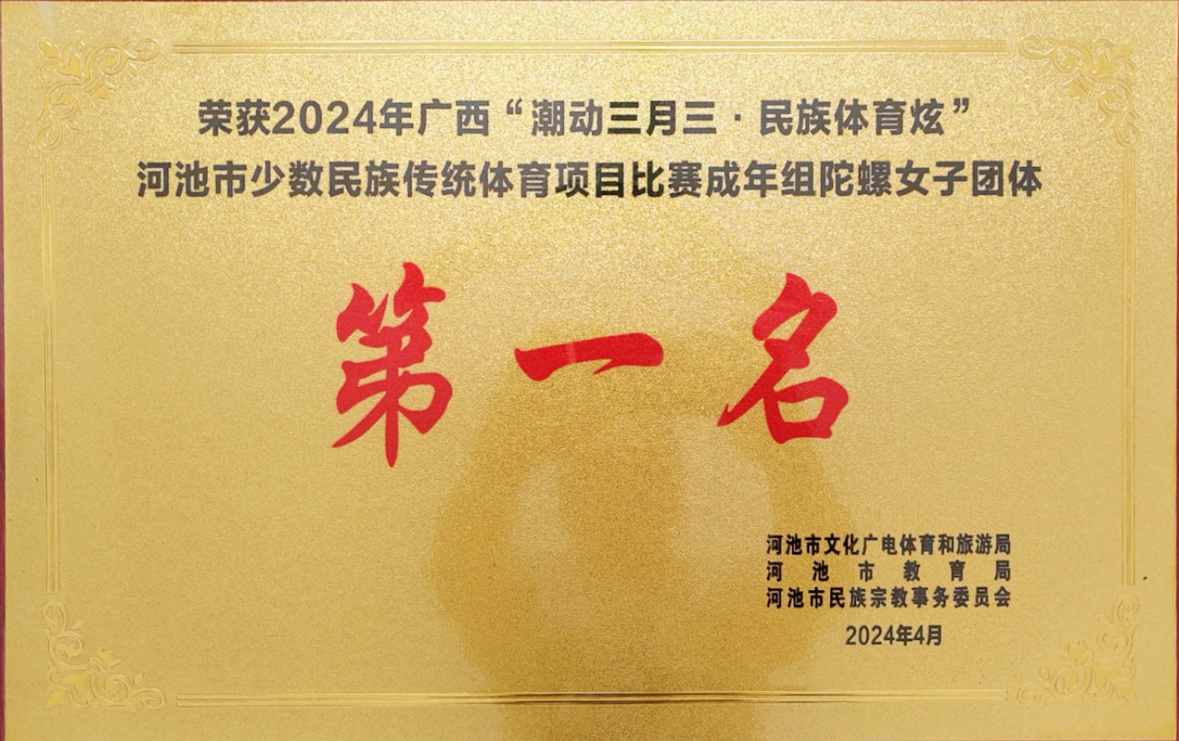 荣获2024年广西“潮动三月三,民族体育炫”河池市少数民族传统体育项目比赛成年组陀螺女子团体第一名-河池市文化广电体育和旅游局