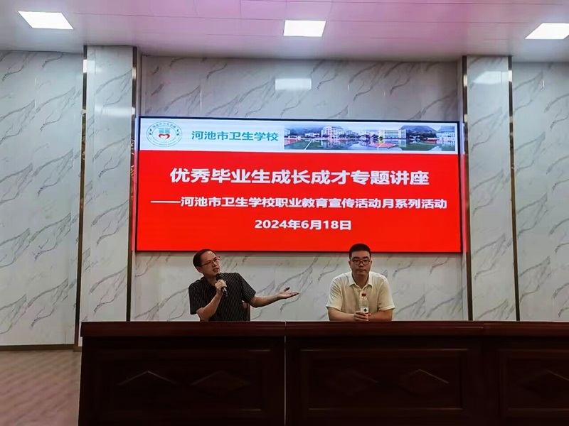 6月18日上午,河池市卫生学校成功举办了一场优秀毕业生“成长成才”专题讲座。 2011级影像专业校友黄正杰应学校邀请返校,为即将踏上实习岗位的2022级影像、检验、中医等七个专业的300多名同学带来了宝贵的经验分享。本次讲座由招生就业办负责人黄鸿宇主持。