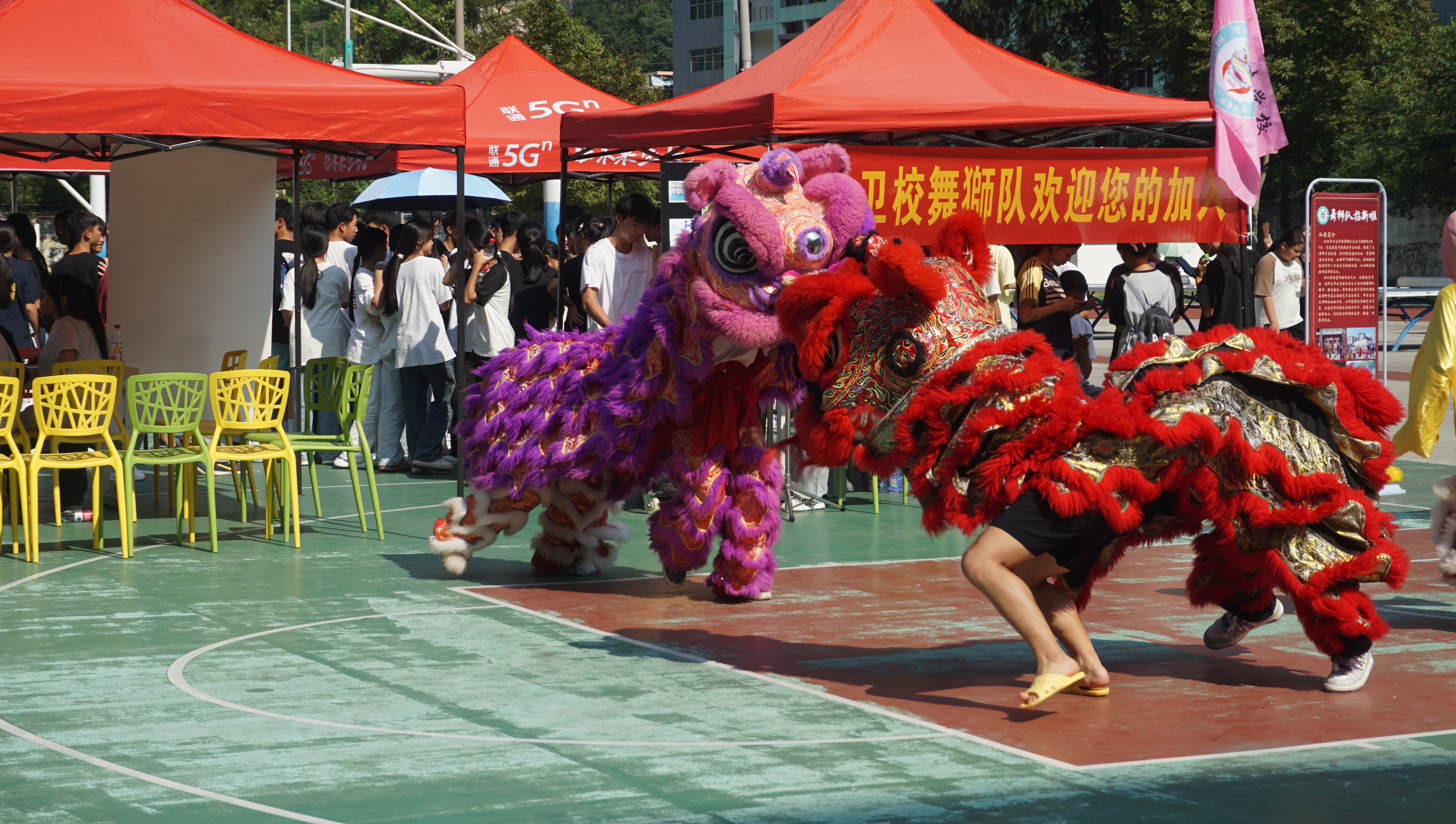 现场气氛十分热烈,同学们兴致高昂。各个社团精心制作海报、布置宣传摊点、展示才华才艺,校礼仪队的同学换上了礼仪服,在秋日的阳光下聘婷生姿;舞狮队通过舞狮表演表演展示舞狮的魅力;心理协会开展心理解压活动,吸引同学们的兴趣;声乐社的同学现场弹奏,洋溢着青春浪漫的音符色彩……