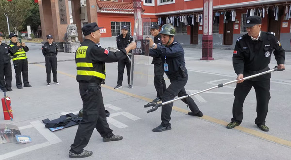 保安队长吴超平首先详细讲解了警棍、盾牌、钢叉、防割手套、防刺背心等防暴器材的正确使用方法,并深入传授了反冲撞、防砍杀及对抗演练等反恐实战技能;然后现场示范了在突发情况下的应急处置流程,包括如何迅速制服“歹徒”、如何有效防止“歹徒”进入人口密集区域等战术技巧;最后组织全体安保人员进行抓捕演练。