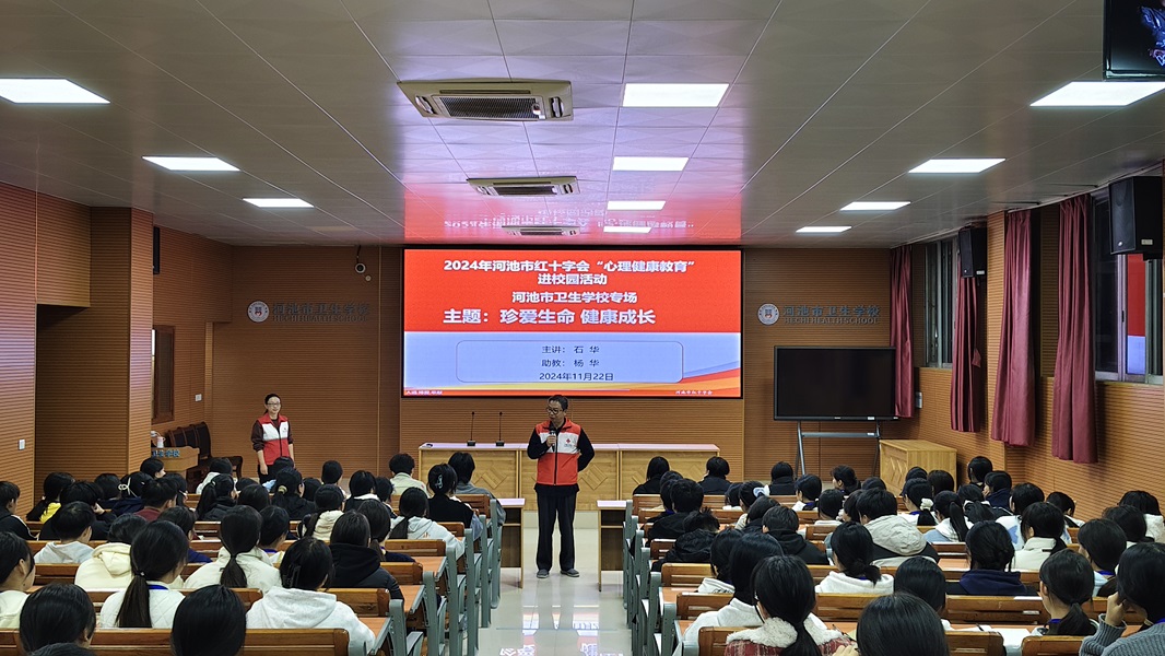 近日,河池市红十字会联合河池市卫校开展“心理健康教育进校园”活动,开展主题为“珍爱生命 健康成长”的讲座,由河池市红十字心理救援队队员、学校心理中心石华老师主讲,对象为2024级各班198位同学