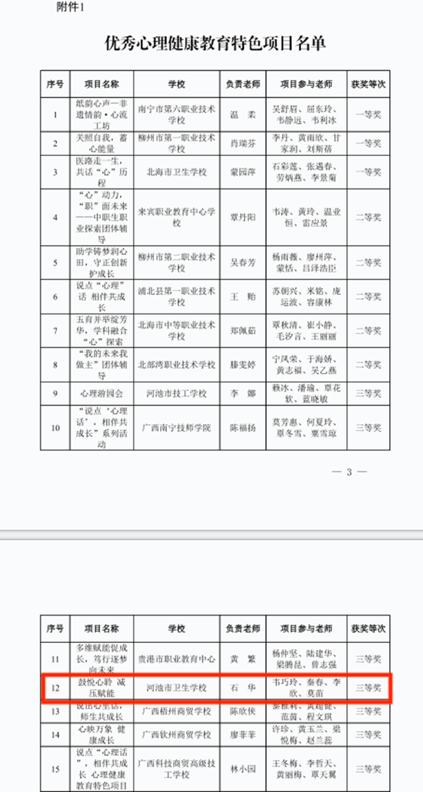 在2024年全区中职学校“5· 25”心理健康教育活动月活动中,经教育厅专家评审,学校心理健康发展中心以“鼓悦心聆·减压赋能”为主题的心理健康教育特色项目获三等奖。