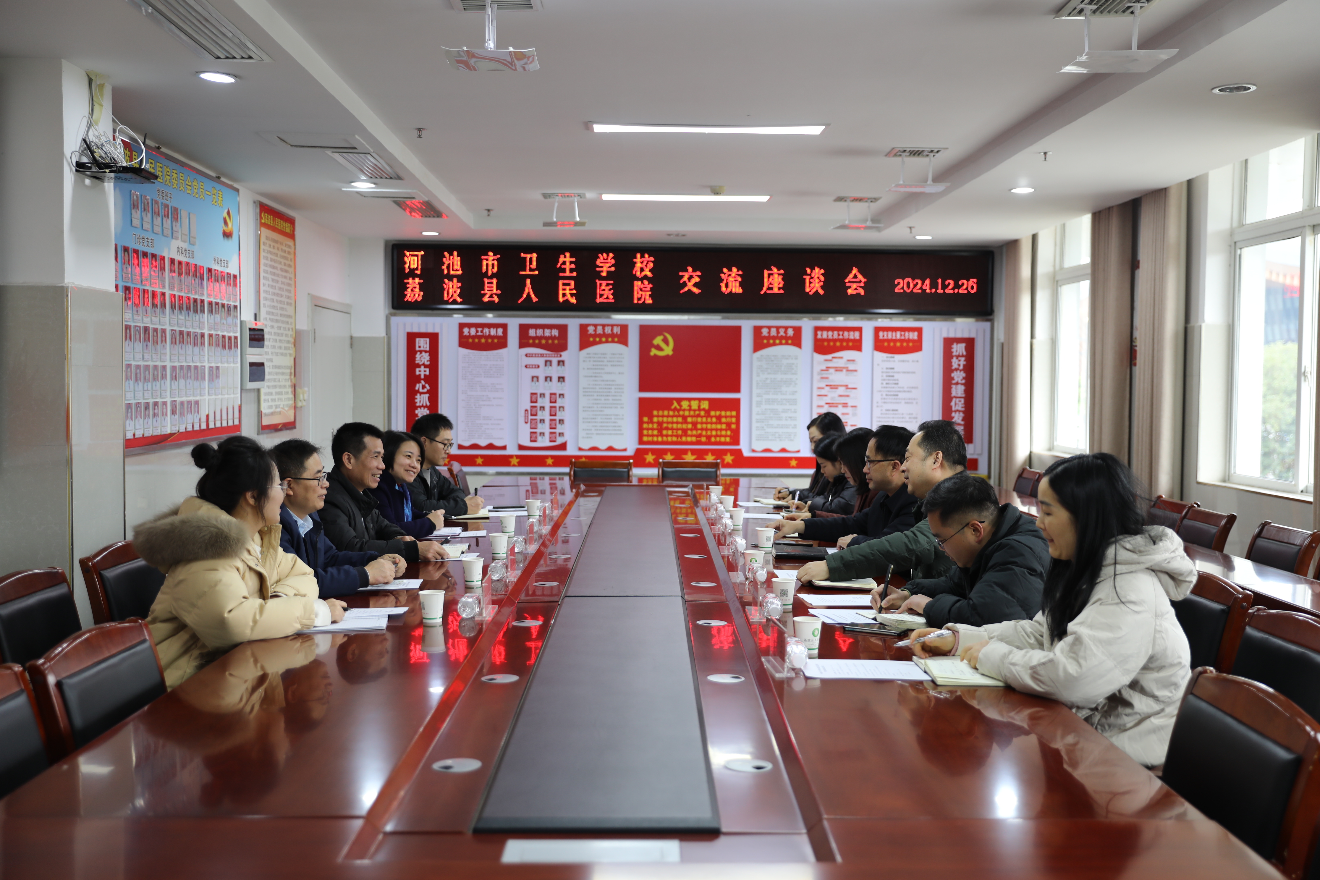 荔波县人民医院副院长莫小仙感谢河池市卫生学校对医院的肯定,并向河池卫校领导介绍了荔波县人民医院重点科室、专科特色、人才建设和未来规划等情况。