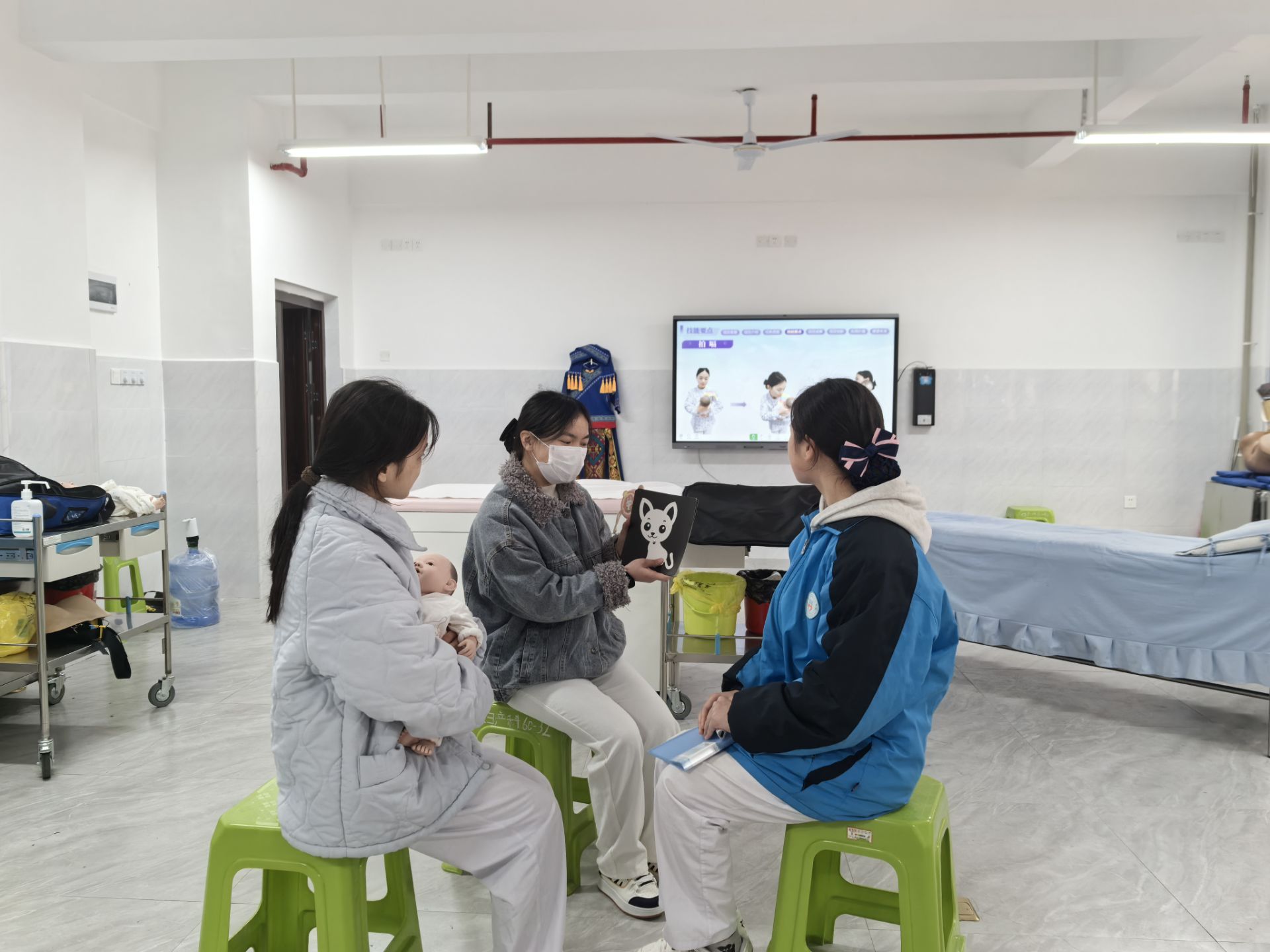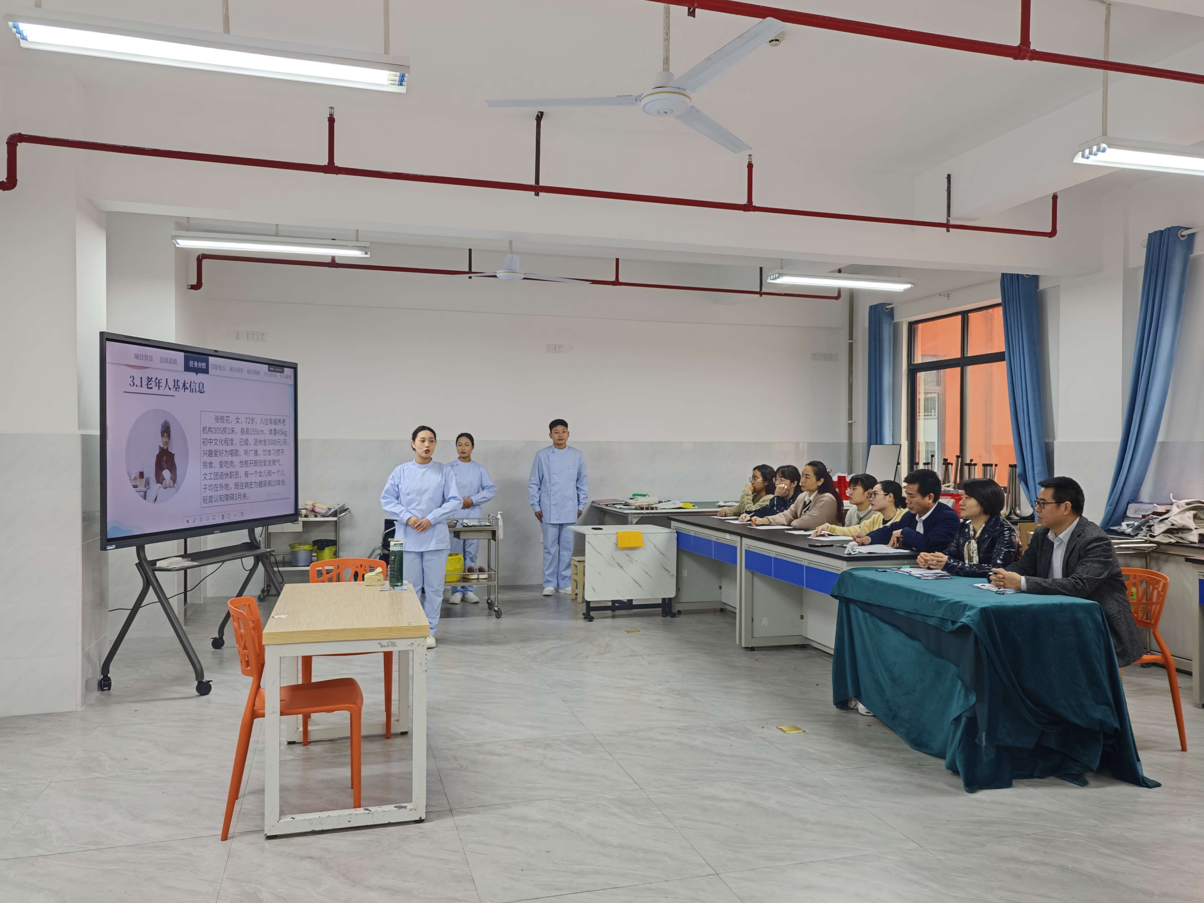 陈朝亮校长、莫苗副校长、刘钢副校长指导选手进行老年照护竞赛训练