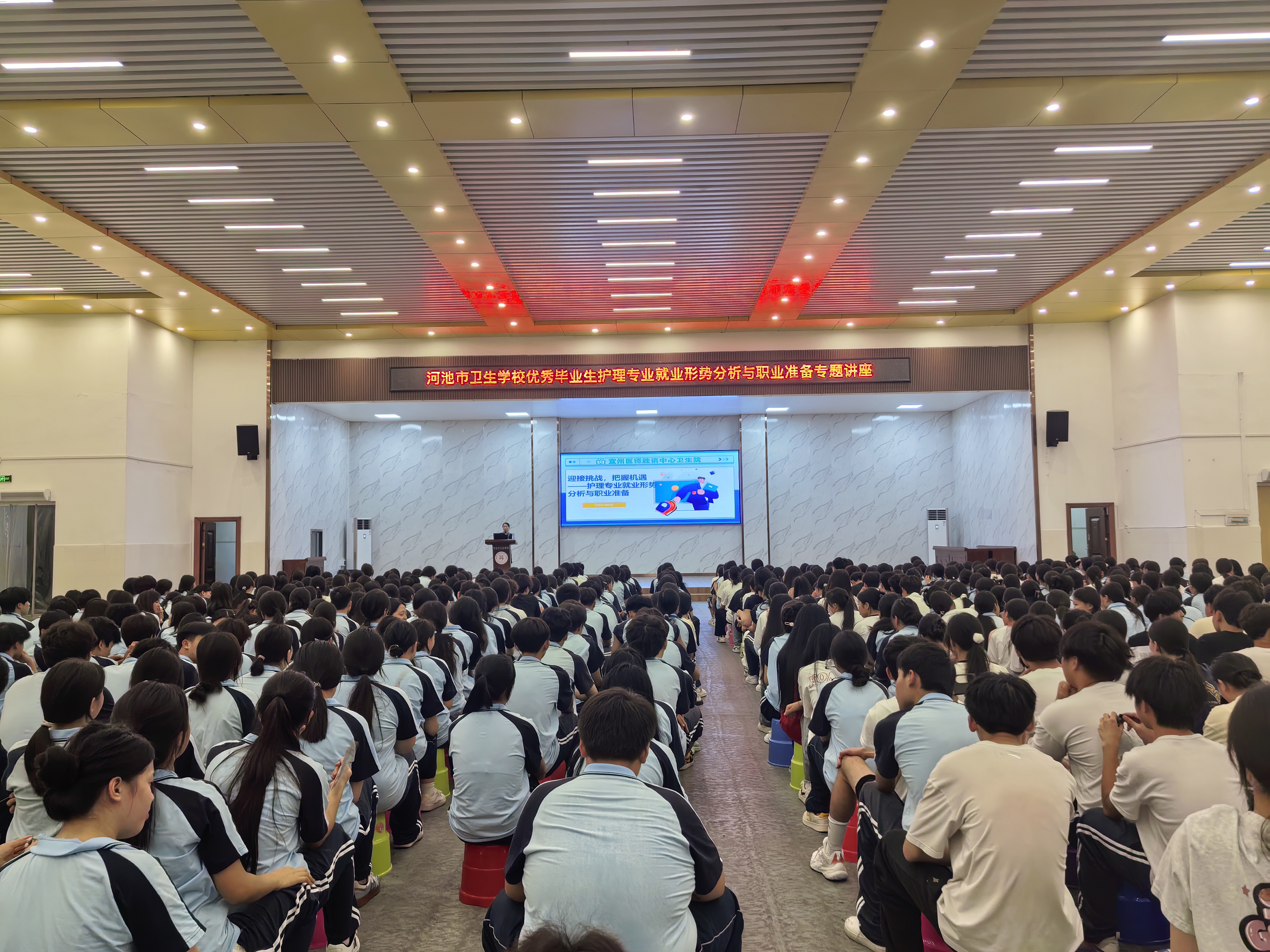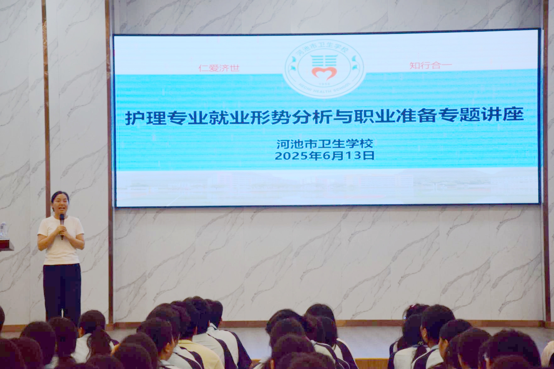 2025年6月13日,河池市卫生学校成功举办了主题为“护理专业就业形势分析与职业准备”的专题讲座,本次活动邀请到宜州区德胜镇中心卫生院护理部主任、优秀毕业生黄秋惠担任主讲嘉宾,2024级护理和中医护理专业500余名师生参与活动,讲座由招生就业办黄艳妮老师主持。