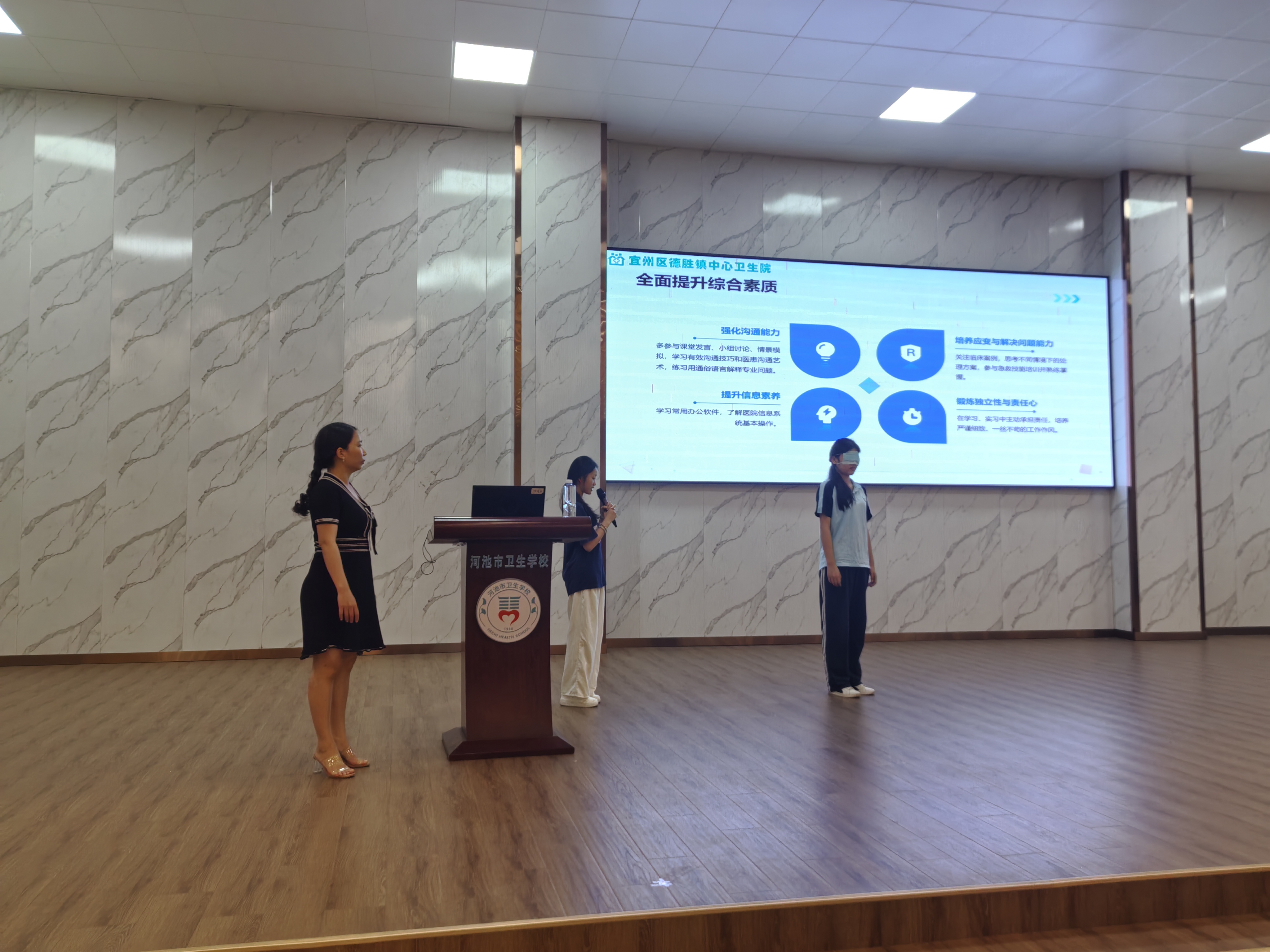 在互动环节,黄秋惠主任邀请两位同学上台做“蒙眼”游戏寻找水瓶。游戏结束后,她告诉学生,患者到医院治病,因为他们没有医学知识,就像蒙了双眼,所以作为一名医护人员,我们必须以患者为中心,了解患者的需求,给患者提供帮助,全心全意为患者服务,急病人之所急,向病人之所向。最后她说到作为护理专业的学生,要勇于迎接挑战,把握机遇,积极准备,适应变化,将目光投向基层,在基层同样能实现职业价值,获得成长,基层不是“退而求其次”,而是“大有可为”的广阔天地。