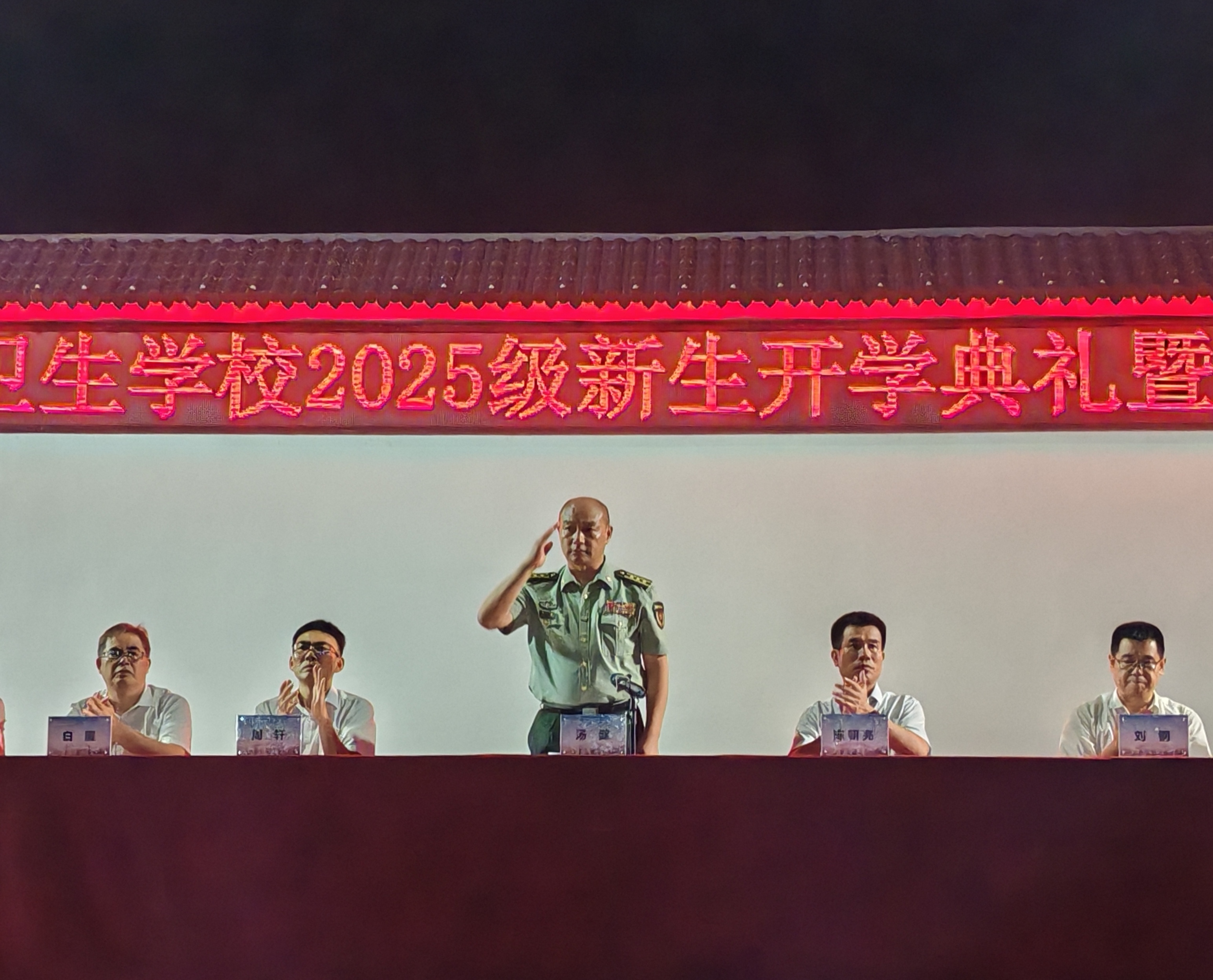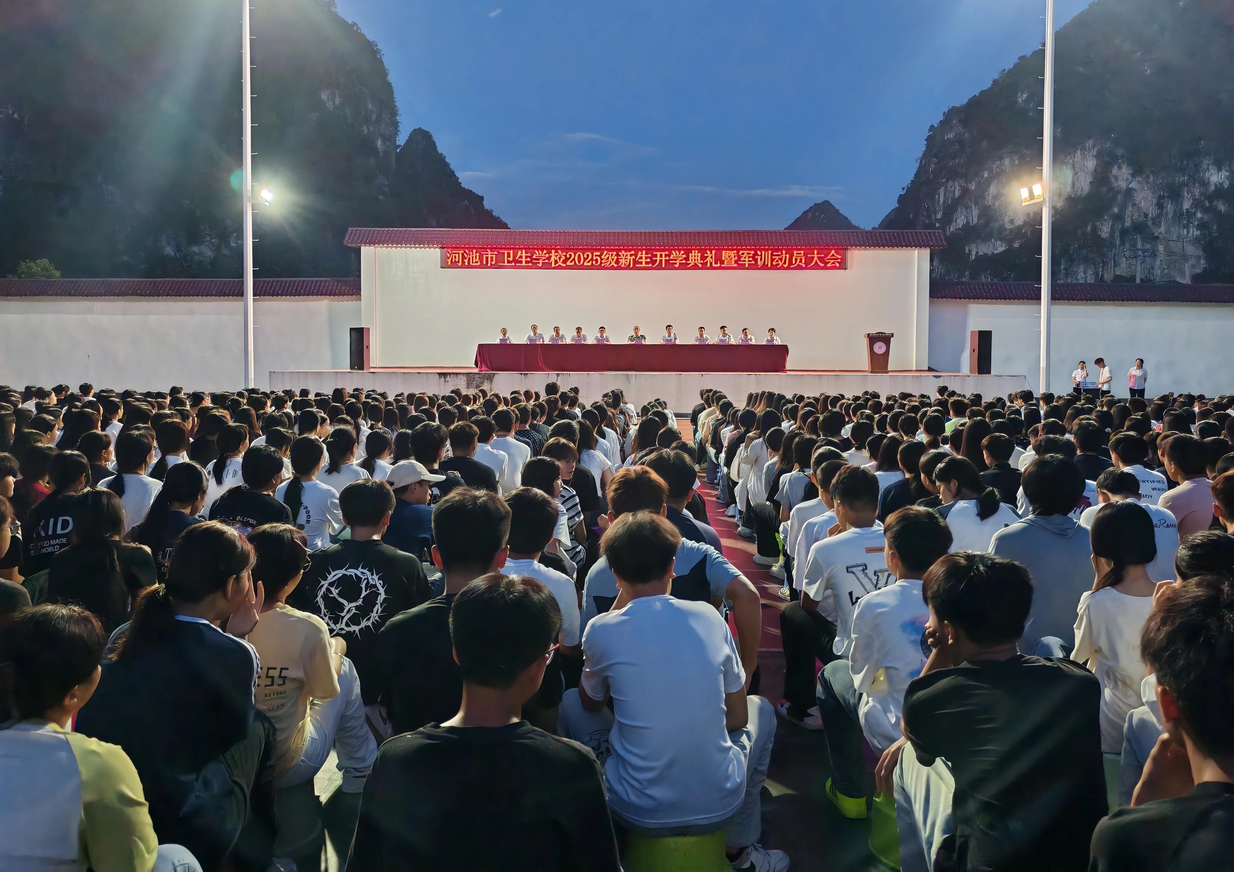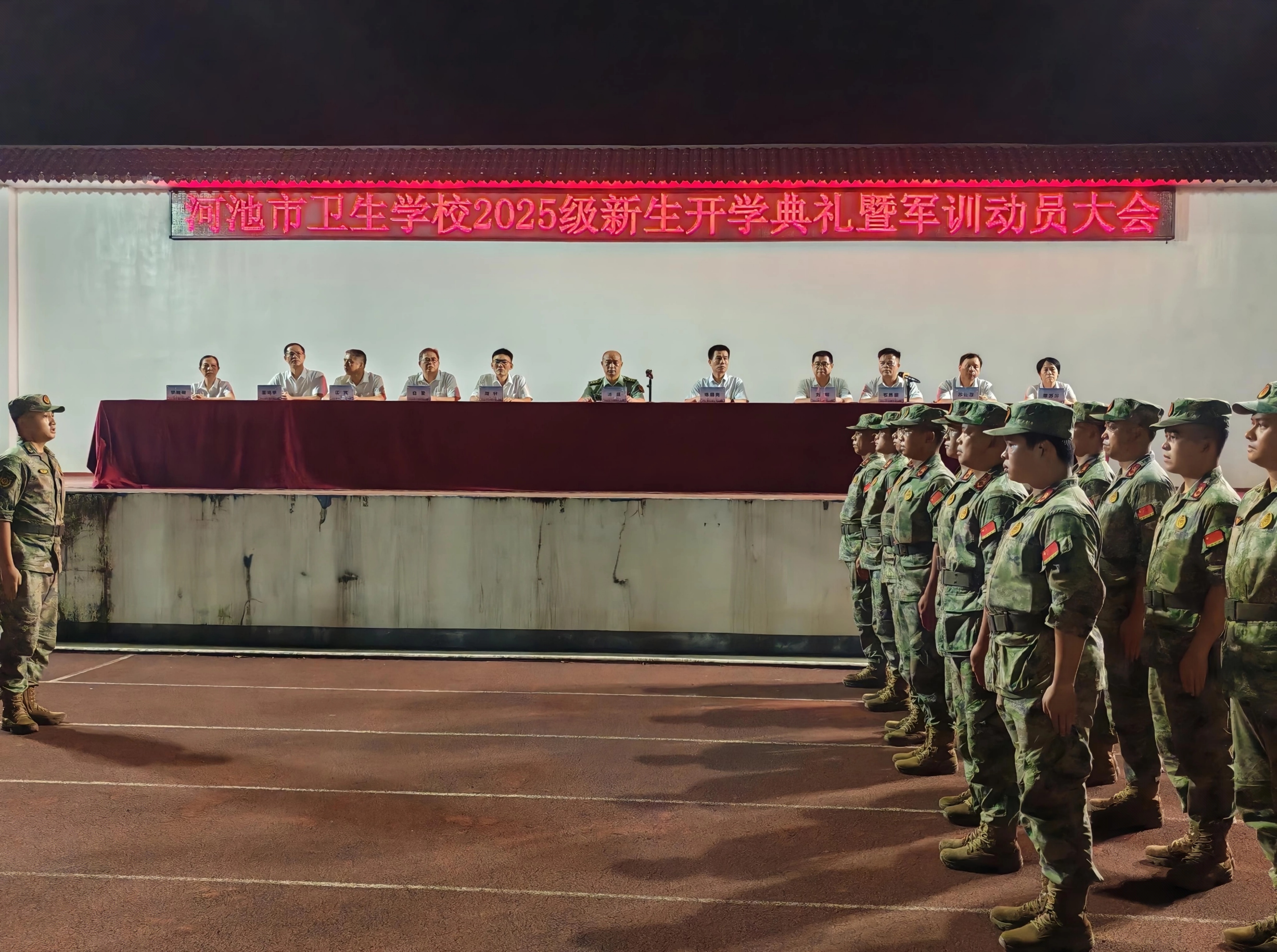 8月26日晚,河池市卫生学校在田径运动场隆重召开2025级新生开学典礼暨军训动员大会。学校领导班子、区人武部部长汤健、全体教官、班主任及2025级全体新生共同参加此次活动。