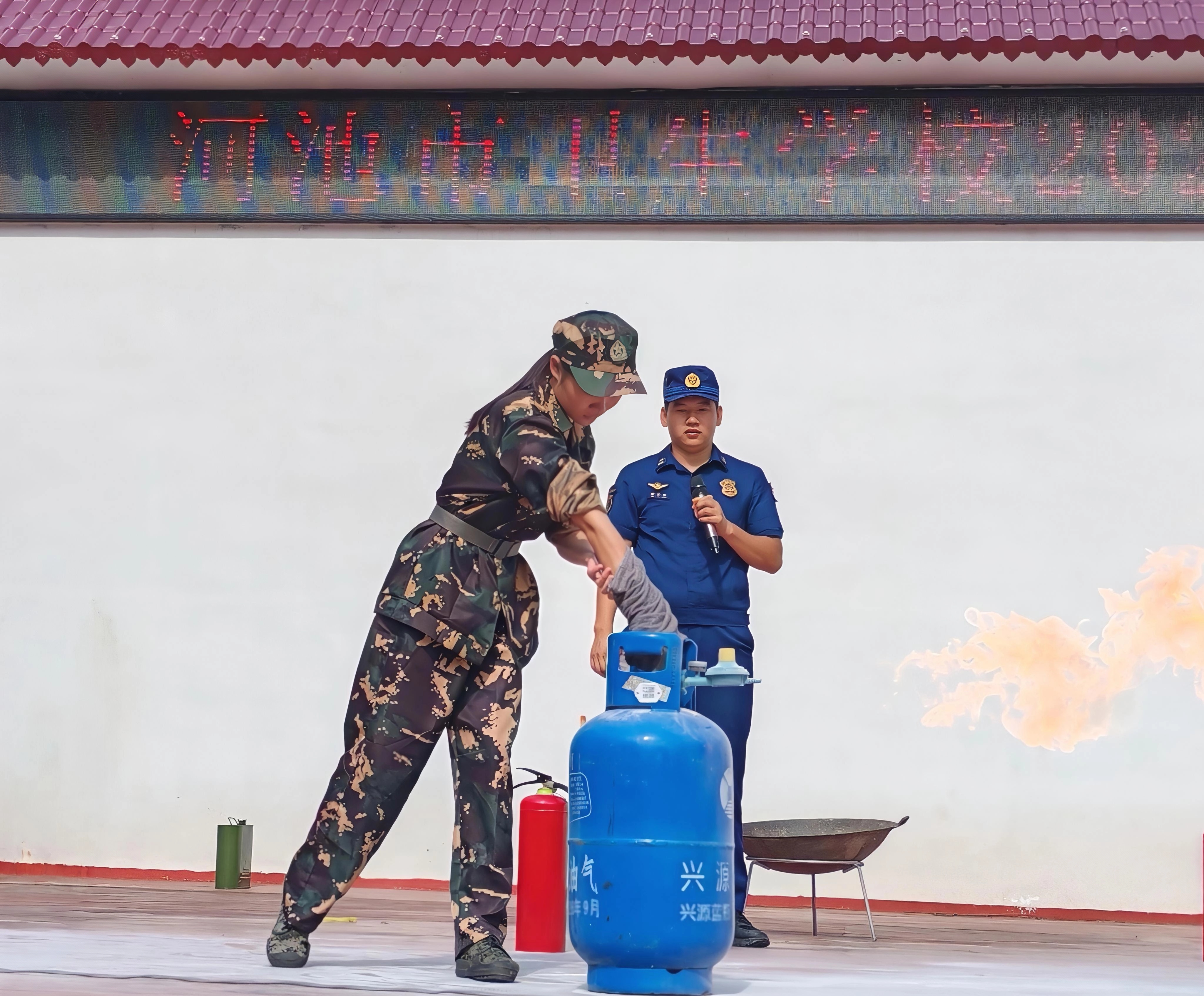 在煤气罐起火模拟环节,消防员现场演示了关阀、覆盖湿布等规范处置方法。互动环节中,多名新生踊跃参与实操演练,消防员一对一指导动作细节,确保学生真正掌握灭火技能。
