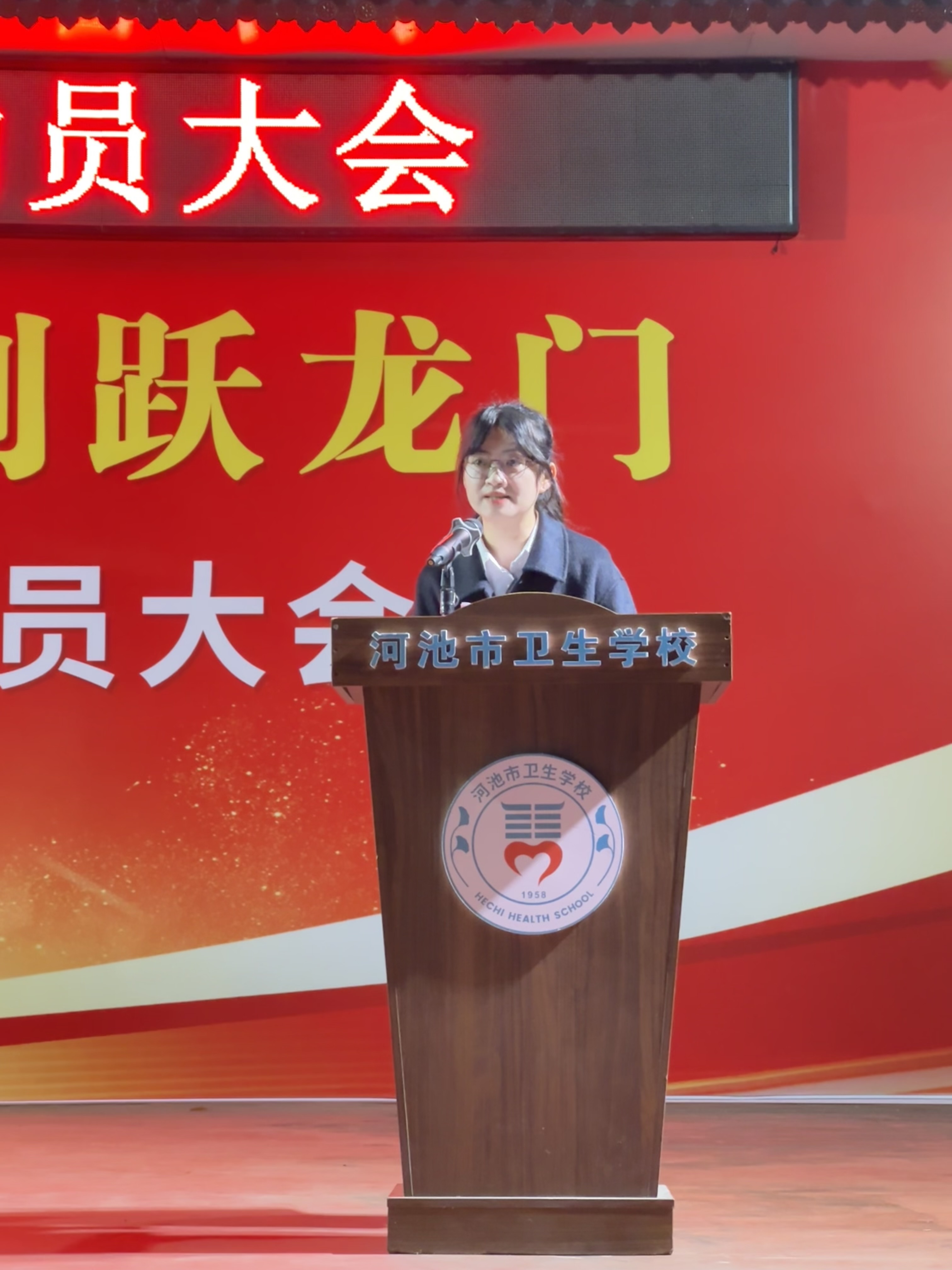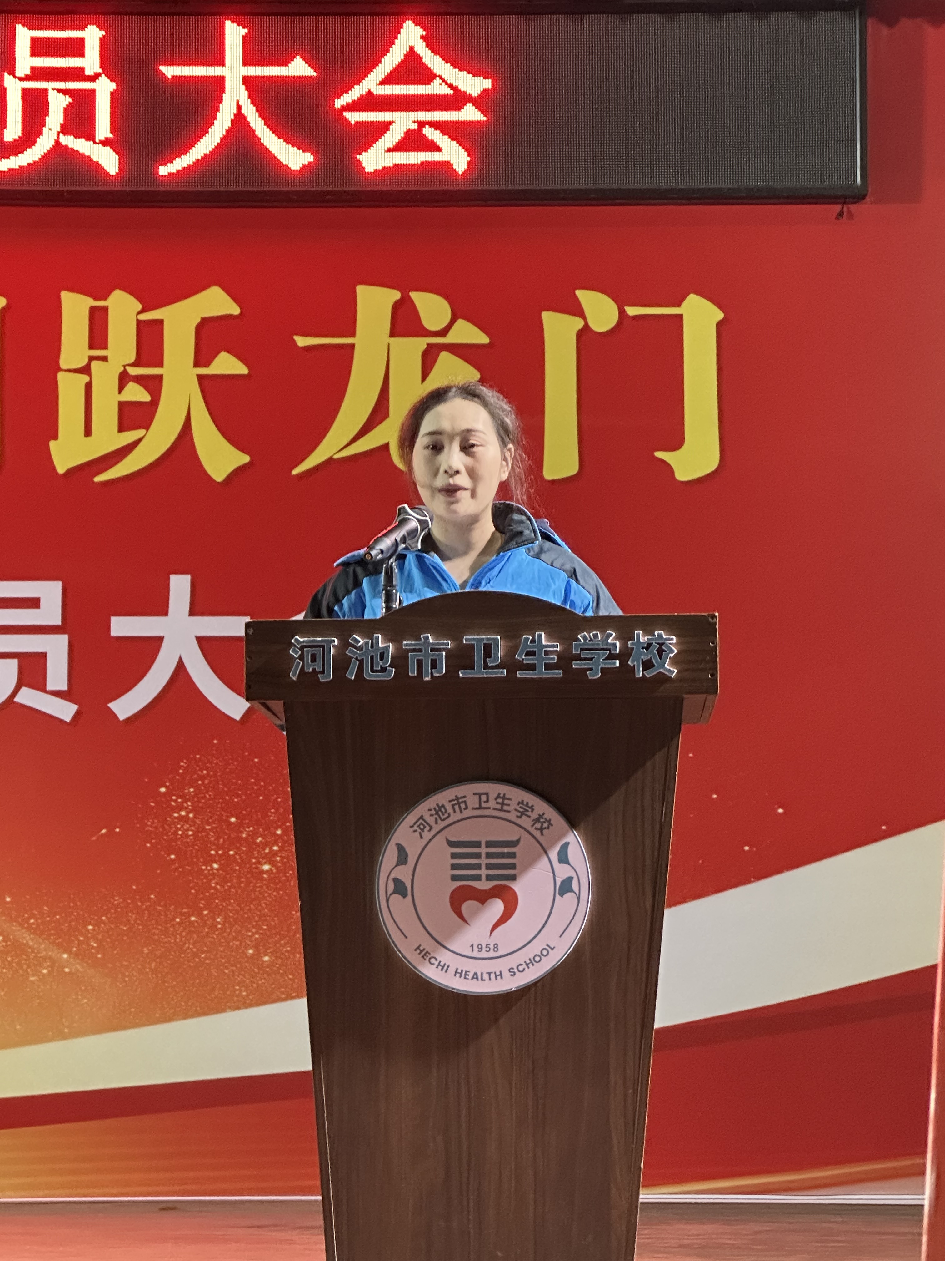 大会伊始,学校办公室曹也主任郑重宣布我校2026届职教高考动员大会正式启动,拉开了这场青春逐梦动员盛会的序幕。紧接着,2023级护理专业的姚芳婷同学作为考生代表登台发言。她以真挚的情感分享了备考路上的成长与感悟,字字铿锵地表达了全体考生不负韶华、全力以赴、决战高考的坚定决心,传递出青年学子奋勇争先的责任与担当。