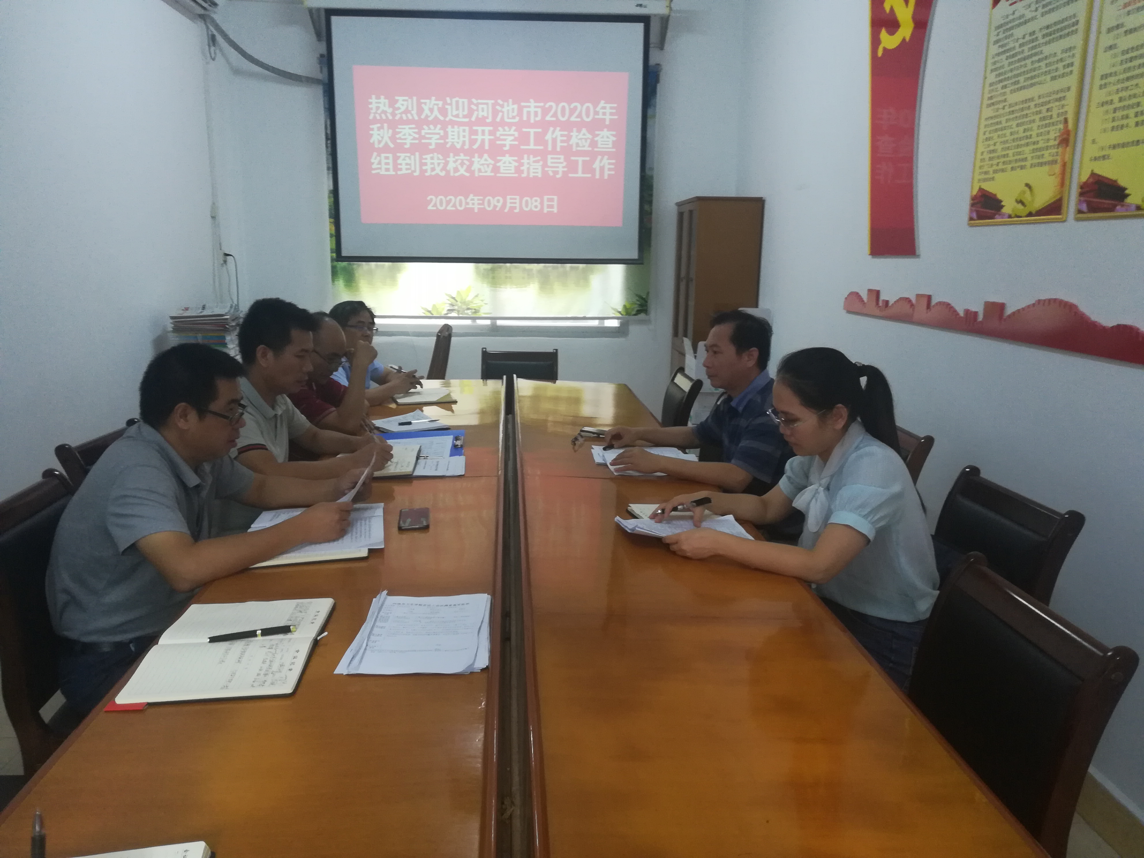 为确保 2020 年秋季学期开学平安顺利、规范有序,各项重点任务如期推进,根据《自治区教育厅关于做好 2020 年秋季学期中小学幼儿园开学工作的通知》(桂教基教〔2020〕72 号)、《自治区教育厅办公室关于开展 2020 年秋季学期中小学幼儿园开学检查工作的通知》(桂教办〔2020〕340号)等文件精神,9月8日下午,由河池市教育局职成科覃泽耀科长、市纪委驻市教育局纪检监察组黄玉广副组长带领的检查组到我校开展2020年秋季学期开学检查工作。检查内容包括开学工作情况、疫情防控工作情况、控辍保学工作情况、招生工作情况等,检查组听取了汇报后,对我校的各项工作进行指导并提出宝贵意见。