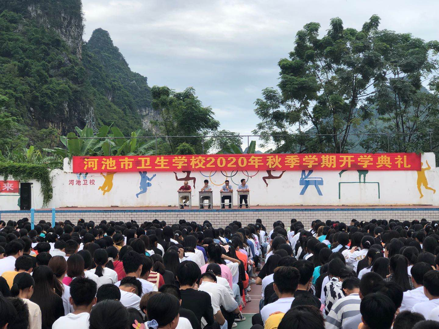 朗朗金秋,丹桂飘香。9月18日下午,河池市卫生学校2020级秋季学期开学典礼在运动场隆重举行。校长陈朝亮、副校长刘钢,副校长周轩、校办公室主任韦恩豪出席典礼。我校2020级1530名全体新生参加了开学典礼。