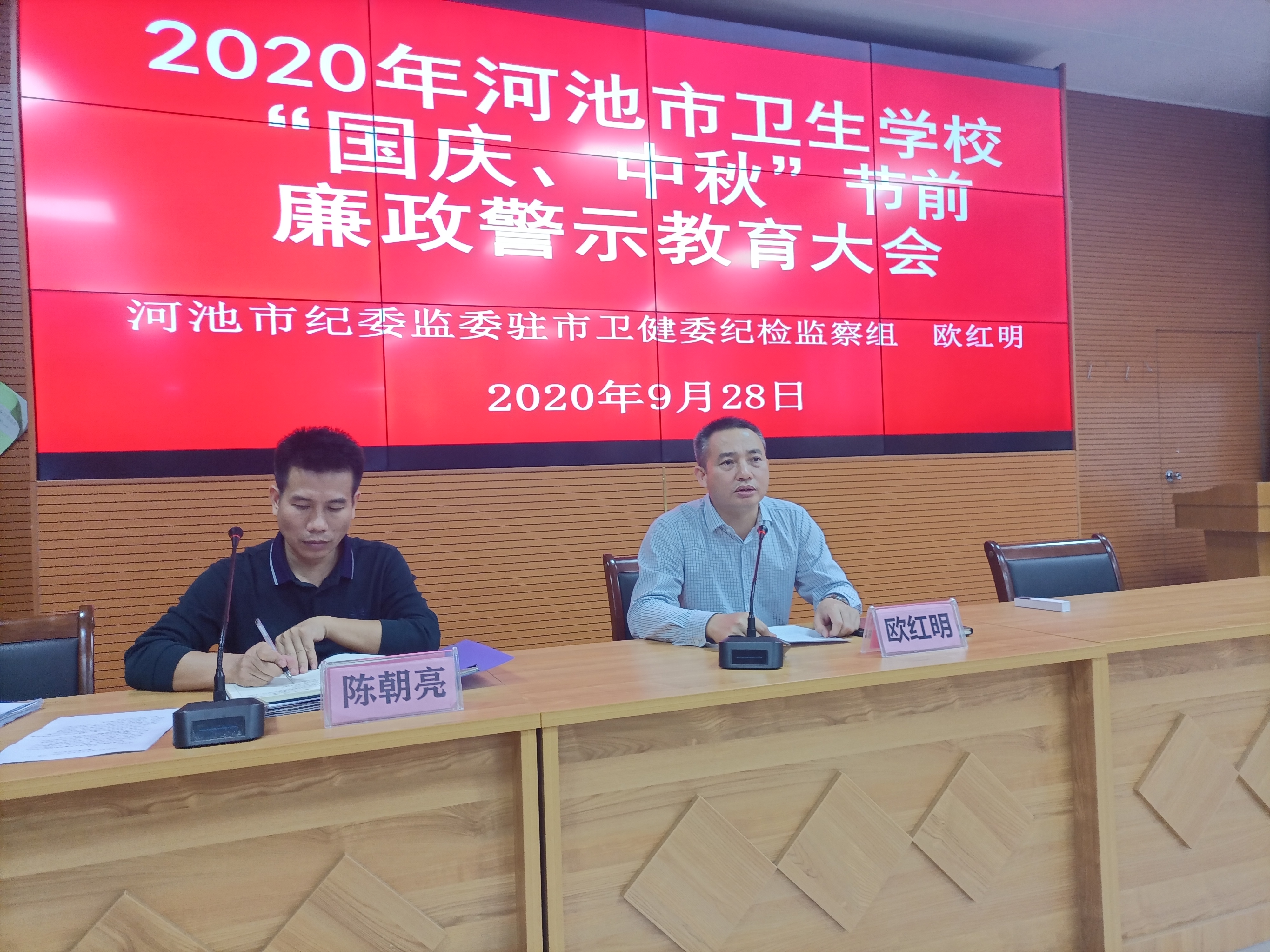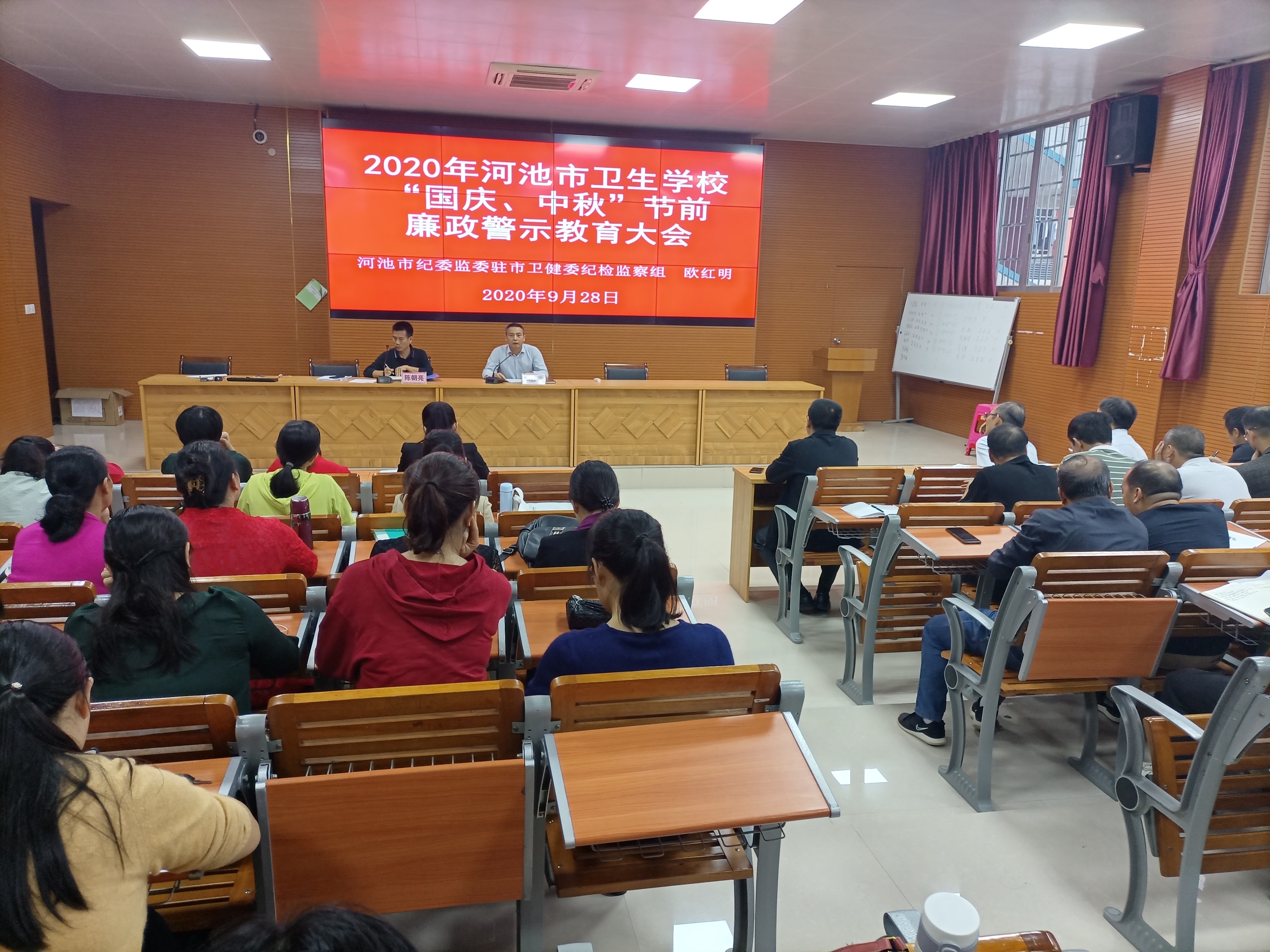 9月28日下午,河池市卫生学校举行2020年国庆、中秋节前反腐倡廉警示教育讲座。会议由校长陈朝亮同志主持,全体教职工、河池市纪委监委驻市卫生健康委纪检监察组两名领导参加会议。